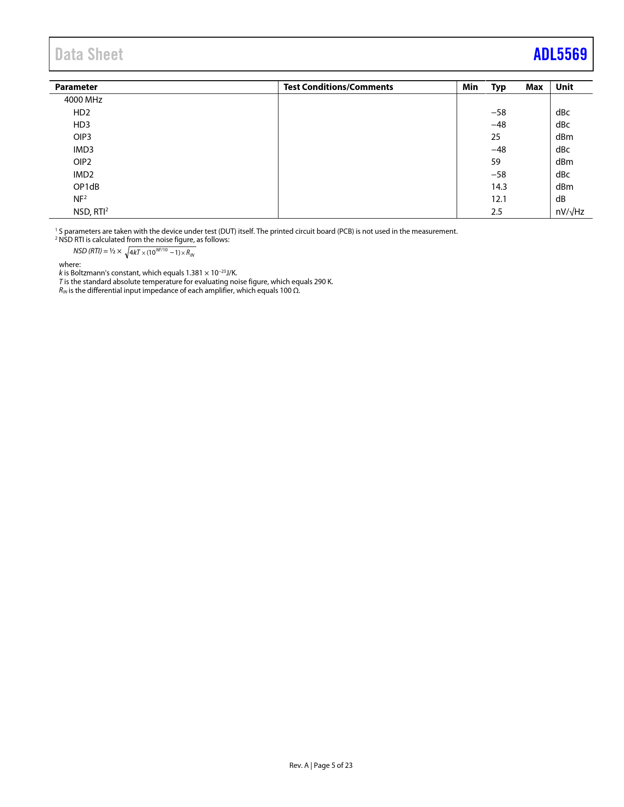 Data SheetADL5569ParameterTest Conditions/CommentsMinTypMaxUnit 4000 MHz HD2 −58 dBc HD3 −48 dBc OIP3 25 dBm IMD3 −48 dBc OIP2 59 dBm IMD2 −58 dBc OP1dB 14.3 dBm NF2 12.1 dB NSD, RTI2 2.5 nV/√Hz 1 S parameters are taken with the device under test (DUT) itself. The printed circuit board (PCB) is not used in the measurement. 2 NSD RTI is calculated from the noise figure, as follows: NSD (RTI) = ½ × NF 4kT × 10 /10 ( −1)× R IN where: k is Boltzmann's constant, which equals 1.381 × 10−23J/K. T is the standard absolute temperature for evaluating noise figure, which equals 290 K. RIN is the differential input impedance of each amplifier, which equals 100 Ω. Rev. A | Page 5 of 23 Document Outline Features Applications Functional Block Diagram General Description Revision History Specifications Absolute Maximum Ratings Thermal Resistance ESD Caution Pin Configuration and Function Descriptions Typical Performance Characteristics Theory of Operation Applications Information Basic Connections Input and Output Interfacing Single-Ended Input to Differential Output Gain Adjustment and Interfacing Effect of Load Capacitance GSPS ADC Interfacing Soldering Information and Recommended Land Pattern Evaluation Board Outline Dimensions Ordering Guide