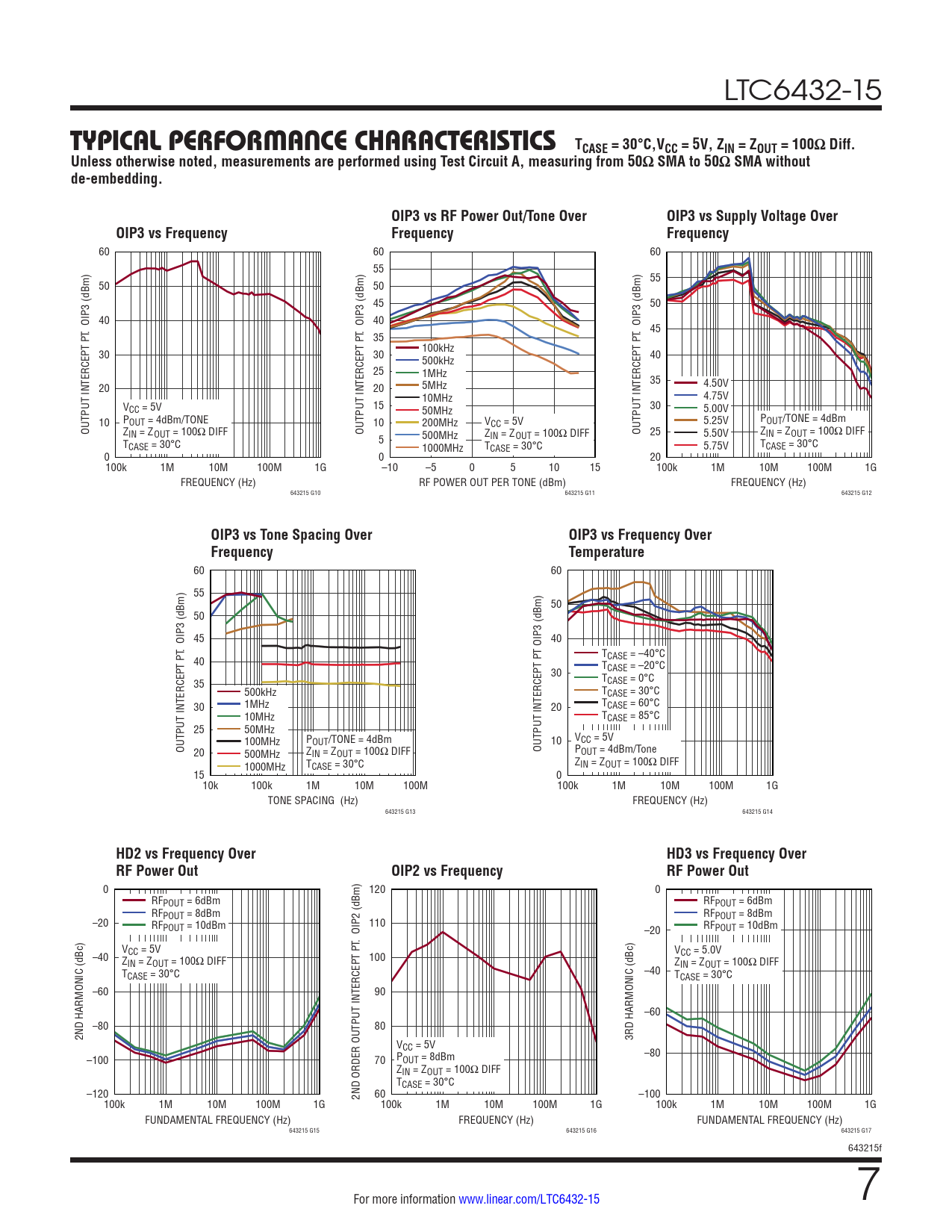 0 120 0 RFPOUT = 6dBm RFPOUT = 6dBm RFPOUT = 8dBm RFPOUT = 8dBm –20 RFPOUT = 10dBm 110 –20 RFPOUT = 10dBm V T. OIP2 (dBm) CC = 5V V –40 CC = 5.0V Z T P 100 IN = ZOUT = 100Ω DIFF ZIN = ZOUT = 100Ω DIFF TCASE = 30°C –40 TCASE = 30°C –60 90 –60 –80 80 2ND HARMONIC (dBc) 3RD HARMONIC (dBc) VCC = 5V –80 –100 P 70 OUT = 8dBm ZIN = ZOUT = 100Ω DIFF TCASE = 30°C –120 2ND ORDER OUTPUT INTERCEP 60 –100 100k 1M 10M 100M 1G 100k 1M 10M 100M 1G 100k 1M 10M 100M 1G FUNDAMENTAL FREQUENCY (Hz) FREQUENCY (Hz) FUNDAMENTAL FREQUENCY (Hz) 643215 G15 643215 G16 643215 G17 643215f For more information www.linear.com/LTC6432-15 7 Document Outline Features Applications Description Typical Application Absolute Maximum Ratings Pin Configuration Order Information DC Electrical Characteristics AC Electrical Characteristics Typical Performance Characteristics Pin Functions Block Diagram Test Circuit A Operation Applications Information Differential S Parameters Package Description Typical Application Related Parts