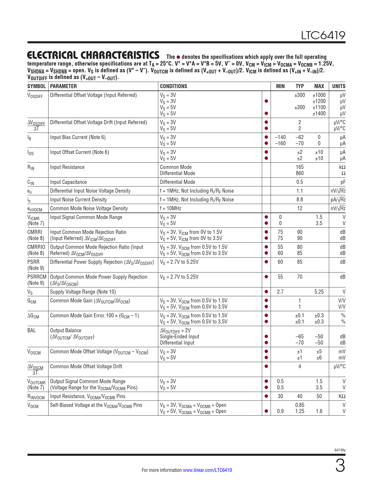 VOSDIFF Differential Offset Voltage (Input Referred) VS = 3V ±300 ±1000 µV VS = 3V l ±1200 µV VS = 5V ±300 ±1100 µV VS = 5V l ±1400 µV ΔVOSDIFF Differential Offset Voltage Drift (Input Referred) VS = 3V l 2 µV/°C ΔT VS = 5V l 2 µV/°C IB Input Bias Current (Note 6) VS = 3V l –140 –62 0 µA VS = 5V l –160 –70 0 µA IOS Input Offset Current (Note 6) VS = 3V l ±2 ±10 µA VS = 5V l ±2 ±10 µA RIN Input Resistance Common Mode 165 kΩ Differential Mode 860 Ω CIN Input Capacitance Differential Mode 0.5 pF en Differential Input Noise Voltage Density f = 1MHz, Not Including RI/RF Noise 1.1 nV/√Hz in Input Noise Current Density f = 1MHz, Not Including RI/RF Noise 8.8 pA/√Hz enVOCM Common Mode Noise Voltage Density f = 10MHz 12 nV/√Hz VICMR Input Signal Common Mode Range VS = 3V l 0 1.5 V (Note 7) VS = 5V l 0 3.5 V CMRRI Input Common Mode Rejection Ratio VS = 3V, VICM from 0V to 1.5V l 75 90 dB (Note 8) (Input Referred) ΔVICM/ΔVOSDIFF VS = 5V, VICM from 0V to 3.5V l 75 90 dB CMRRIO Output Common Mode Rejection Ratio (Input VS = 3V, VOCM from 0.5V to 1.5V l 55 80 dB (Note 8) Referred) ΔVOCM/ΔVOSDIFF VS = 5V, VOCM from 0.5V to 3.5V l 60 85 dB PSRR Differential Power Supply Rejection (ΔVS/ΔVOSDIFF) VS = 2.7V to 5.25V l 60 85 dB (Note 9) PSRRCM Output Common Mode Power Supply Rejection VS = 2.7V to 5.25V l 55 70 dB (Note 9) (ΔVS/ΔVOSCM) VS Supply Voltage Range (Note 10) l 2.7 5.25 V GCM Common Mode Gain (ΔVOUTCM/ΔVOCM) VS = 3V, VOCM from 0.5V to 1.5V l 1 V/V VS = 5V, VOCM from 0.5V to 3.5V l 1 V/V ΔGCM Common Mode Gain Error, 100 × (GCM – 1) VS = 3V, VOCM from 0.5V to 1.5V l ±0.1 ±0.3 % VS = 5V, VOCM from 0.5V to 3.5V l ±0.1 ±0.3 % BAL Output Balance ΔVOUTDIFF = 2V (ΔVOUTCM/ ΔVOUTDIFF) Single-Ended Input l –65 –50 dB Differential Input l –70 –50 dB VOSCM Common Mode Offset Voltage (VOUTCM – VOCM) VS = 3V l ±1 ±5 mV VS = 5V l ±1 ±6 mV ΔVOSCM Common Mode Offset Voltage Drift l 4 µV/°C ΔT VOUTCMR Output Signal Common Mode Range VS = 3V l 0.5 1.5 V (Note 7) (Voltage Range for the VOCMA/VOCMB Pins) VS = 5V l 0.5 3.5 V RINVOCM Input Resistance, VOCMA/VOCMB Pins l 30 40 50 KΩ VOCM Self-Biased Voltage at the VOCMA/VOCMB Pins VS = 3V, VOCMA = VOCMB = Open 0.85 V VS = 5V, VOCMA = VOCMB = Open l 0.9 1.25 1.6 V 6419fa For more information www.linear.com/LTC6419 3 Document Outline Features Applications Description Typical Application Absolute Maximum Ratings Pin Configuration Order Information Typical Performance Characteristics Pin Functions Applications Information Typical Applications Typical Applications Related Parts