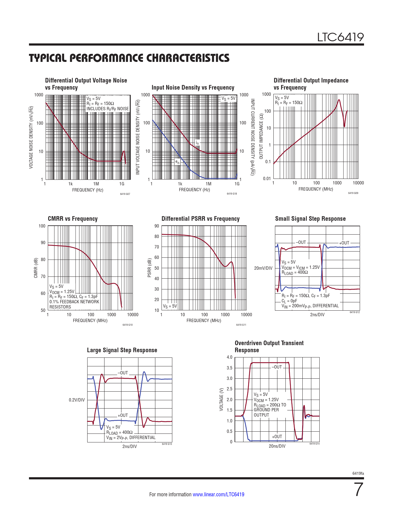 100 90 80 90 –OUT +OUT 70 80 60 VS = 5V 50 20mV/DIV VOCM = VICM = 1.25V RLOAD = 400Ω CMRR (dB) 70 PSRR (dB) 40 VS = 5V V 30 60 OCM = 1.25V RI = RF = 150Ω, CF = 1.3pF RI = RF = 150Ω, CF = 1.3pF 0.1% FEEDBACK NETWORK 20 CL = 0pF RESISTORS VS = 5V VIN = 200mVP-P, DIFFERENTIAL 50 10 1 10 100 1000 10000 1 10 100 1000 10000 2ns/DIV 6419 G12 FREQUENCY (MHz) FREQUENCY (MHz) 6419 G10 6419 G11