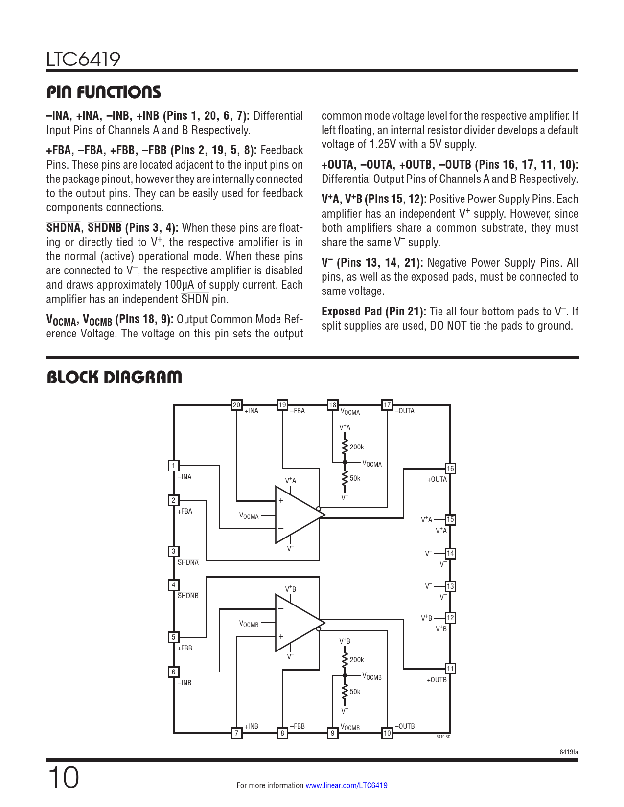 20 19 18 17 +INA –FBA VOCMA –OUTA V+A 200k VOCMA 1 16 –INA 50k V+A +OUTA V– 2 + +FBA VOCMA V+A 15 – V+A V– 3 V– 14 SHDNA V– 4 V+B V– 13 SHDNB V– – V+B 12 VOCMB V+B + 5 V+B +FBB V– 200k 6 11 VOCMB –INB +OUTB 50k V– +INB –FBB VOCMB –OUTB 7 8 9 10 6419 BD 6419fa 10 For more information www.linear.com/LTC6419 Document Outline Features Applications Description Typical Application Absolute Maximum Ratings Pin Configuration Order Information Typical Performance Characteristics Pin Functions Applications Information Typical Applications Typical Applications Related Parts