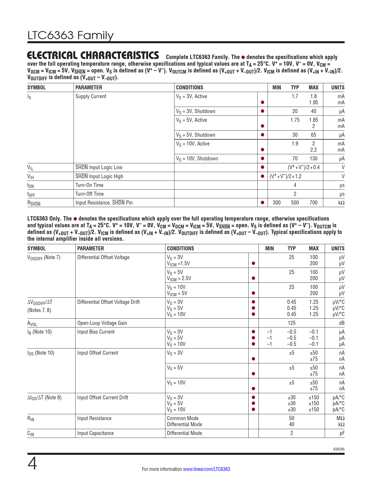 LTC6363 Family ELECTRICAL CHARACTERISTICS Complete LTC6363 Family. The l denotes the specifications which applyover the full operating temperature range, otherwise specifications and typical values are at TA = 25°C. V+ = 10V, V– = 0V, VCM =VOCM = VICM = 5V, VSHDN = open. VS is defined as (V+ – V–). VOUTCM is defined as (V+OUT + V–OUT)/2. VICM is defined as (V+IN + V–IN)/2.VOUTDIFF is defined as (V+OUT – V–OUT). SYMBOLPARAMETERCONDITIONSMINTYPMAXUNITS IS Supply Current VS = 3V, Active 1.7 1.8 mA l 1.95 mA VS = 3V, Shutdown l 20 40 µA VS = 5V, Active 1.75 1.85 mA l 2 mA VS = 5V, Shutdown l 30 65 µA VS = 10V, Active 1.9 2 mA l 2.2 mA VS = 10V, Shutdown l 70 130 µA VIL SHDN Input Logic Low l (V+ + V–)/2 + 0.4 V VIH SHDN Input Logic High l (V+ + V–)/2 + 1.2 V tON Turn-On Time 4 μs tOFF Turn-Off Time 2 μs RSHDN Input Resistance, SHDN Pin l 300 500 700 kΩ LTC6363 Only. The l denotes the specifications which apply over the full operating temperature range, otherwise specificationsand typical values are at TA = 25°C. V+ = 10V, V– = 0V, VCM = VOCM = VICM = 5V, VSHDN = open. VS is defined as (V+ – V–). VOUTCM isdefined as (V+OUT + V–OUT)/2. VICM is defined as (V+IN + V–IN)/2. VOUTDIFF is defined as (V+OUT – V–OUT). Typical specifications apply tothe internal amplifier inside all versions. SYMBOLPARAMETERCONDITIONSMINTYPMAXUNITS VOSDIFF (Note 7) Differential Offset Voltage VS = 3V 25 100 µV VICM =1.5V l 200 µV VS = 5V 25 100 µV VICM = 2.5V l 200 µV VS = 10V 25 100 µV VICM = 5V l 200 µV ∆VOSDIFF/∆T Differential Offset Voltage Drift VS = 3V l 0.45 1.25 µV/°C (Notes 7, 8) VS = 5V l 0.45 1.25 µV/°C VS = 10V l 0.45 1.25 µV/°C AVOL Open-Loop Voltage Gain 125 dB IB (Note 10) Input Bias Current VS = 3V l –1 –0.5 –0.1 µA VS = 5V l –1 –0.5 –0.1 µA VS = 10V l –1 –0.5 –0.1 µA IOS (Note 10) Input Offset Current VS = 3V ±5 ±50 nA l ±75 nA VS = 5V ±5 ±50 nA l ±75 nA VS = 10V ±5 ±50 nA l ±75 nA ∆IOS/∆T (Note 8) Input Offset Current Drift VS = 3V l ±30 ±150 pA/°C VS = 5V l ±30 ±150 pA/°C VS = 10V l ±30 ±150 pA/°C RIN Input Resistance Common Mode 50 MΩ Differential Mode 40 kΩ CIN Input Capacitance Differential Mode 2 pF 6363fb 4 For more information www.linear.com/LTC6363