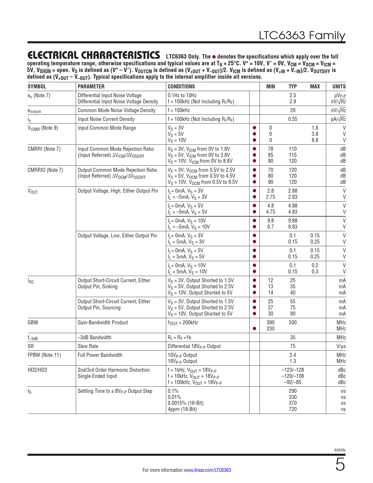 LTC6363 Family ELECTRICAL CHARACTERISTICS LTC6363 Only. The l denotes the specifications which apply over the fulloperating temperature range, otherwise specifications and typical values are at TA = 25°C. V+ = 10V, V– = 0V, VCM = VOCM = VICM =5V, VSHDN = open. VS is defined as (V+ – V–). VOUTCM is defined as (V+OUT + V–OUT)/2. VICM is defined as (V+IN + V–IN)/2. VOUTDIFF isdefined as (V+OUT – V–OUT). Typical specifications apply to the internal amplifier inside all versions.SYMBOLPARAMETERCONDITIONSMINTYPMAXUNITS en (Note 7) Differential Input Noise Voltage 0.1Hz to 10Hz 2.5 µVP-P Differential Input Noise Voltage Density f = 100kHz (Not Including RI/RF) 2.9 nV/√Hz envocm Common Mode Noise Voltage Density f = 100kHz 20 nV/√Hz in Input Noise Current Density f = 100kHz (Not Including RI/RF) 0.55 pA/√Hz VICMR (Note 9) Input Common Mode Range VS = 3V l 0 1.8 V VS = 5V l 0 3.8 V VS = 10V l 0 8.8 V CMRRI (Note 7) Input Common Mode Rejection Ratio VS = 3V, VICM from 0V to 1.8V l 78 110 dB (Input Referred) ∆VICM/∆VOSDIFF VS = 5V, VICM from 0V to 3.8V l 85 115 dB VS = 10V, VICM from 0V to 8.8V l 90 120 dB CMRRIO (Note 7) Output Common Mode Rejection Ratio VS = 3V, VOCM from 0.5V to 2.5V l 70 120 dB (Input Referred) ∆VOCM/∆VOSDIFF VS = 5V, VOCM from 0.5V to 4.5V l 80 120 dB VS = 10V, VOCM from 0.5V to 9.5V l 90 120 dB VOUT Output Voltage, High, Either Output Pin IL= 0mA, VS = 3V l 2.8 2.88 V IL = –5mA, VS = 3V l 2.75 2.83 V IL= 0mA, VS = 5V l 4.8 4.88 V IL = –5mA, VS = 5V l 4.75 4.83 V IL= 0mA, VS = 10V l 9.8 9.88 V IL = –5mA, VS = 10V l 9.7 9.83 V Output Voltage, Low, Either Output Pin IL= 0mA, VS = 3V l 0.1 0.15 V IL = 5mA, VS = 3V l 0.15 0.25 V IL= 0mA, VS = 5V l 0.1 0.15 V IL = 5mA, VS = 5V l 0.15 0.25 V IL= 0mA, VS = 10V l 0.1 0.2 V IL = 5mA, VS = 10V l 0.15 0.3 V ISC Output Short-Circuit Current, Either VS = 3V, Output Shorted to 1.5V l 12 25 mA Output Pin, Sinking VS = 5V, Output Shorted to 2.5V l 13 35 mA VS = 10V, Output Shorted to 5V l 14 40 mA Output Short-Circuit Current, Either VS = 3V, Output Shorted to 1.5V l 25 55 mA Output Pin, Sourcing VS = 5V, Output Shorted to 2.5V l 27 75 mA VS = 10V, Output Shorted to 5V l 30 90 mA GBW Gain-Bandwidth Product fTEST = 200kHz 390 500 MHz l 230 MHz f–3dB –3dB Bandwidth RI = RF =1k 35 MHz SR Slew Rate Differential 18VP-P Output 75 V/μs FPBW (Note 11) Full Power Bandwidth 10VP-P Output 2.4 MHz 18VP-P Output 1.3 MHz HD2/HD3 2nd/3rd Order Harmonic Distortion f = 1kHz, VOUT = 18VP-P –123/–128 dBc Single-Ended Input f = 10kHz, VOUT = 18VP-P –120/–108 dBc f = 100kHz, VOUT = 18VP-P –92/–85 dBc tS Settling Time to a 8VP-P Output Step 0.1% 290 ns 0.01% 330 ns 0.0015% (16-Bit) 370 ns 4ppm (18-Bit) 720 ns 6363fb For more information www.linear.com/LTC6363 5