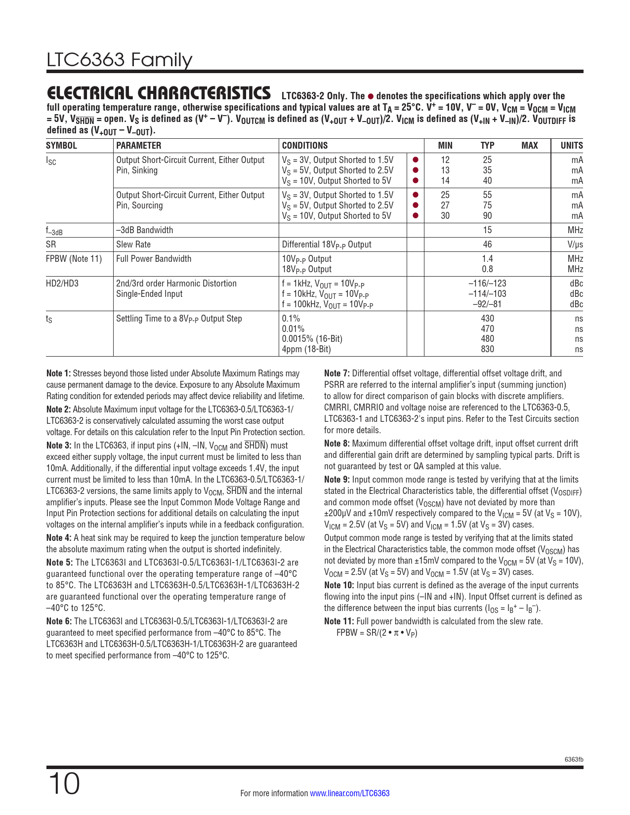 LTC6363 Family ELECTRICAL CHARACTERISTICS LTC6363-2 Only. The l denotes the specifications which apply over thefull operating temperature range, otherwise specifications and typical values are at TA = 25°C. V+ = 10V, V– = 0V, VCM = VOCM = VICM= 5V, VSHDN = open. VS is defined as (V+ – V–). VOUTCM is defined as (V+OUT + V–OUT)/2. VICM is defined as (V+IN + V–IN)/2. VOUTDIFF isdefined as (V+OUT – V–OUT).SYMBOLPARAMETERCONDITIONSMINTYPMAXUNITS ISC Output Short-Circuit Current, Either Output VS = 3V, Output Shorted to 1.5V l 12 25 mA Pin, Sinking VS = 5V, Output Shorted to 2.5V l 13 35 mA VS = 10V, Output Shorted to 5V l 14 40 mA Output Short-Circuit Current, Either Output VS = 3V, Output Shorted to 1.5V l 25 55 mA Pin, Sourcing VS = 5V, Output Shorted to 2.5V l 27 75 mA VS = 10V, Output Shorted to 5V l 30 90 mA f–3dB –3dB Bandwidth 15 MHz SR Slew Rate Differential 18VP-P Output 46 V/µs FPBW (Note 11) Full Power Bandwidth 10VP-P Output 1.4 MHz 18VP-P Output 0.8 MHz HD2/HD3 2nd/3rd order Harmonic Distortion f = 1kHz, VOUT = 10VP-P –116/–123 dBc Single-Ended Input f = 10kHz, VOUT = 10VP-P –114/–103 dBc f = 100kHz, VOUT = 10VP-P –92/–81 dBc tS Settling Time to a 8VP-P Output Step 0.1% 430 ns 0.01% 470 ns 0.0015% (16-Bit) 480 ns 4ppm (18-Bit) 830 ns Note 1: Stresses beyond those listed under Absolute Maximum Ratings may Note 7: Differential offset voltage, differential offset voltage drift, and cause permanent damage to the device. Exposure to any Absolute Maximum PSRR are referred to the internal amplifier’s input (summing junction) Rating condition for extended periods may affect device reliability and lifetime. to allow for direct comparison of gain blocks with discrete amplifiers. Note 2: Absolute Maximum input voltage for the LTC6363-0.5/LTC6363-1/ CMRRI, CMRRIO and voltage noise are referenced to the LTC6363-0.5, LTC6363-2 is conservatively calculated assuming the worst case output LTC6363-1 and LTC6363-2's input pins. Refer to the Test Circuits section voltage. For details on this calculation refer to the Input Pin Protection section. for more details. Note 3: In the LTC6363, if input pins (+IN, –IN, V Note 8: Maximum differential offset voltage drift, input offset current drift OCM and SHDN) must exceed either supply voltage, the input current must be limited to less than and differential gain drift are determined by sampling typical parts. Drift is 10mA. Additionally, if the differential input voltage exceeds 1.4V, the input not guaranteed by test or QA sampled at this value. current must be limited to less than 10mA. In the LTC6363-0.5/LTC6363-1/ Note 9: Input common mode range is tested by verifying that at the limits LTC6363-2 versions, the same limits apply to VOCM, SHDN and the internal stated in the Electrical Characteristics table, the differential offset (VOSDIFF) amplifier’s inputs. Please see the Input Common Mode Voltage Range and and common mode offset (VOSCM) have not deviated by more than Input Pin Protection sections for additional details on calculating the input ±200µV and ±10mV respectively compared to the VICM = 5V (at VS = 10V), voltages on the internal amplifier’s inputs while in a feedback configuration. VICM = 2.5V (at VS = 5V) and VICM = 1.5V (at VS = 3V) cases. Note 4: A heat sink may be required to keep the junction temperature below Output common mode range is tested by verifying that at the limits stated the absolute maximum rating when the output is shorted indefinitely. in the Electrical Characteristics table, the common mode offset (VOSCM) has Note 5: The LTC6363I and LTC6363I-0.5/LTC6363I-1/LTC6363I-2 are not deviated by more than ±15mV compared to the VOCM = 5V (at VS = 10V), guaranteed functional over the operating temperature range of –40°C VOCM = 2.5V (at VS = 5V) and VOCM = 1.5V (at VS = 3V) cases. to 85°C. The LTC6363H and LTC6363H-0.5/LTC6363H-1/LTC6363H-2 Note 10: Input bias current is defined as the average of the input currents are guaranteed functional over the operating temperature range of flowing into the input pins (–IN and +IN). Input Offset current is defined as –40°C to 125°C. the difference between the input bias currents (I + – OS = IB – IB ). Note 6: The LTC6363I and LTC6363I-0.5/LTC6363I-1/LTC6363I-2 are Note 11: Full power bandwidth is calculated from the slew rate. guaranteed to meet specified performance from –40°C to 85°C. The FPBW = SR/(2 • π • VP) LTC6363H and LTC6363H-0.5/LTC6363H-1/LTC6363H-2 are guaranteed to meet specified performance from –40°C to 125°C. 6363fb 10 For more information www.linear.com/LTC6363