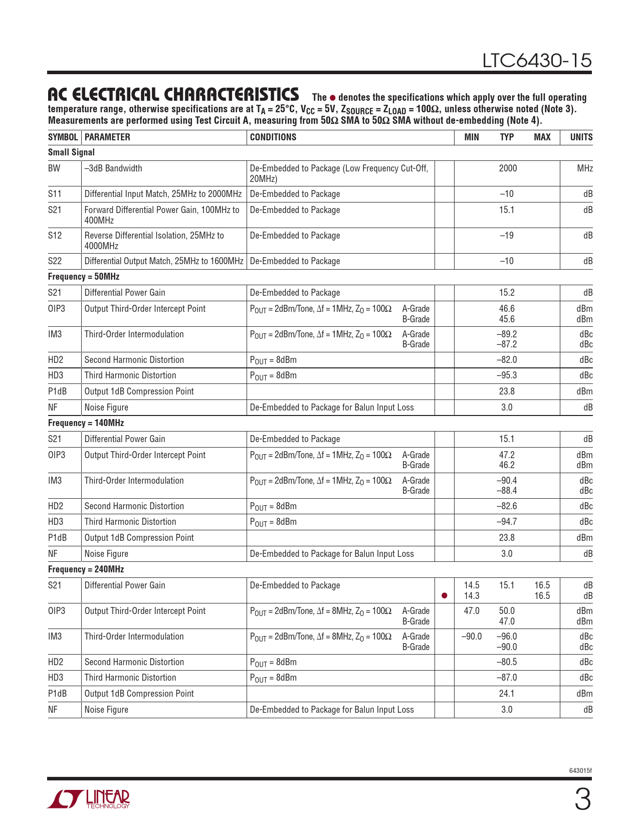 S21 Differential Power Gain De-Embedded to Package 14.5 15.1 16.5 dB l 14.3 16.5 dB OIP3 Output Third-Order Intercept Point POUT = 2dBm/Tone, Δf = 8MHz, ZO = 100Ω A-Grade 47.0 50.0 dBm B-Grade 47.0 dBm IM3 Third-Order Intermodulation POUT = 2dBm/Tone, Δf = 8MHz, ZO = 100Ω A-Grade –90.0 –96.0 dBc B-Grade –90.0 dBc HD2 Second Harmonic Distortion POUT = 8dBm –80.5 dBc HD3 Third Harmonic Distortion POUT = 8dBm –87.0 dBc P1dB Output 1dB Compression Point 24.1 dBm NF Noise Figure De-Embedded to Package for Balun Input Loss 3.0 dB 643015f 3 Document Outline Features Applications Description Typical Application Absolute Maximum Ratings Pin Configuration Order Information DC Electrical Characteristics AC Electrical Characteristics Typical Performance Characteristics Pin Functions Block Diagram Test Circuit A Operation Applications Information Differential S Parameters Typical Applications Package Description Typical Application Related Parts