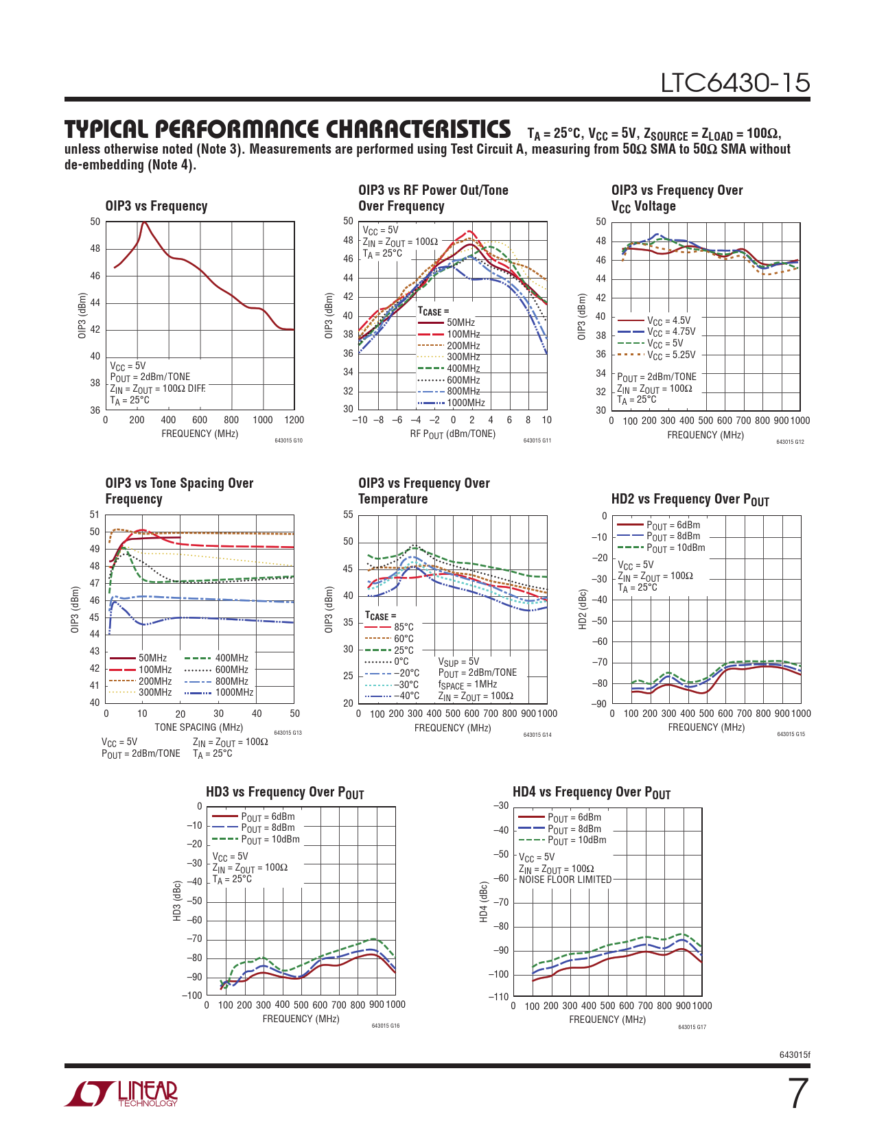 –50 OIP3 (dBm) 85°C HD2 (dBc) 44 OIP3 (dBm) 60°C –60 43 30 25°C 50MHz 400MHz 0°C V 42 –70 100MHz 600MHz SUP = 5V –20°C P 200MHz 800MHz 25 OUT = 2dBm/TONE 41 –30°C f –80 300MHz 1000MHz SPACE = 1MHz –40°C Z 40 20 IN = ZOUT = 100Ω –90 0 10 20 30 40 50 0 100 200 300 400 500 600 700 800 900 1000 0 100 200 300 400 500 600 700 800 900 1000 TONE SPACING (MHz) FREQUENCY (MHz) FREQUENCY (MHz) 643015 G13 643015 G14 643015 G15 VCC = 5V ZIN = ZOUT = 100Ω POUT = 2dBm/TONE TA = 25°C