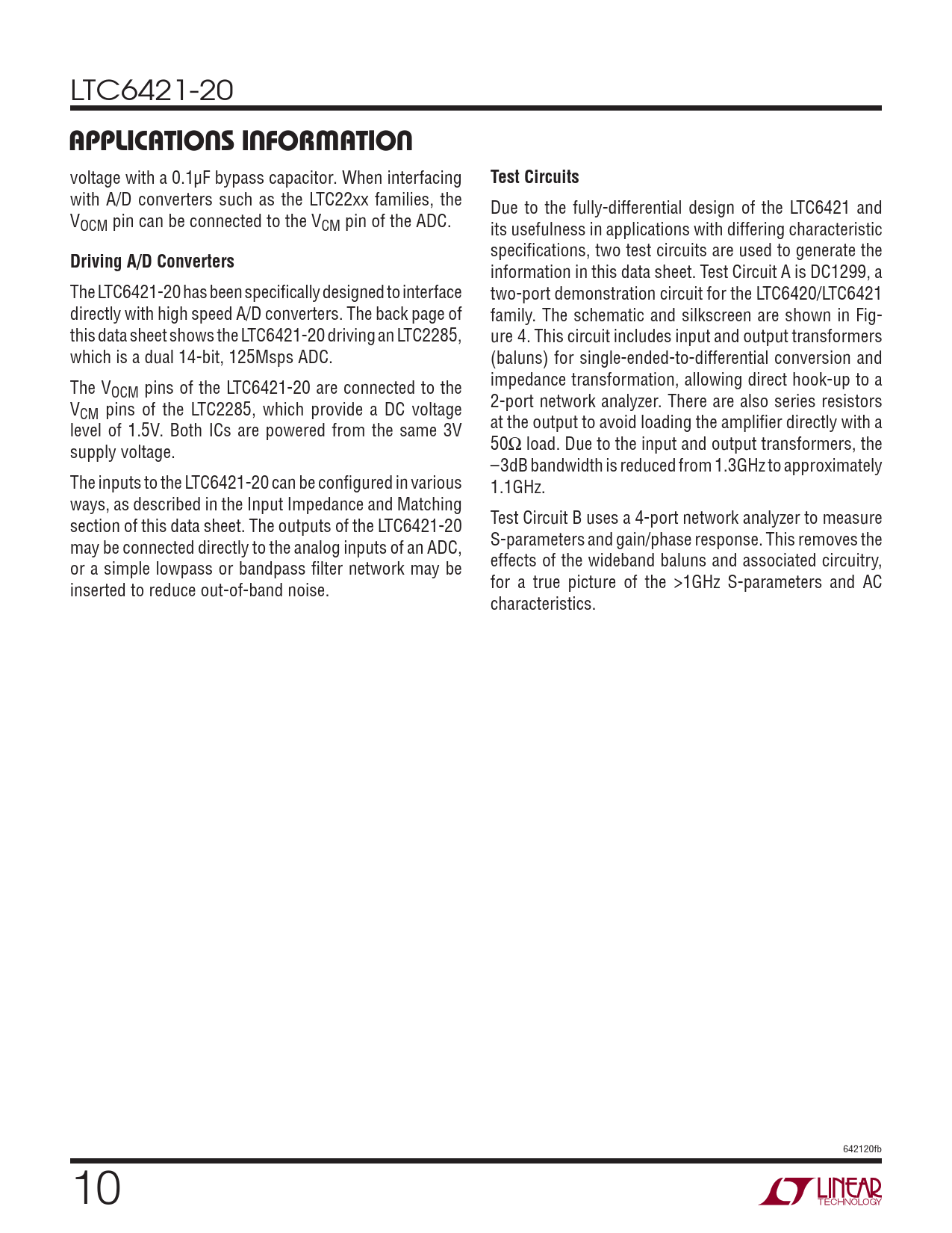 with A/D converters such as the LTC22xx families, the Due to the fully-differential design of the LTC6421 and VOCM pin can be connected to the VCM pin of the ADC. its usefulness in applications with differing characteristic specifi cations, two test circuits are used to generate the