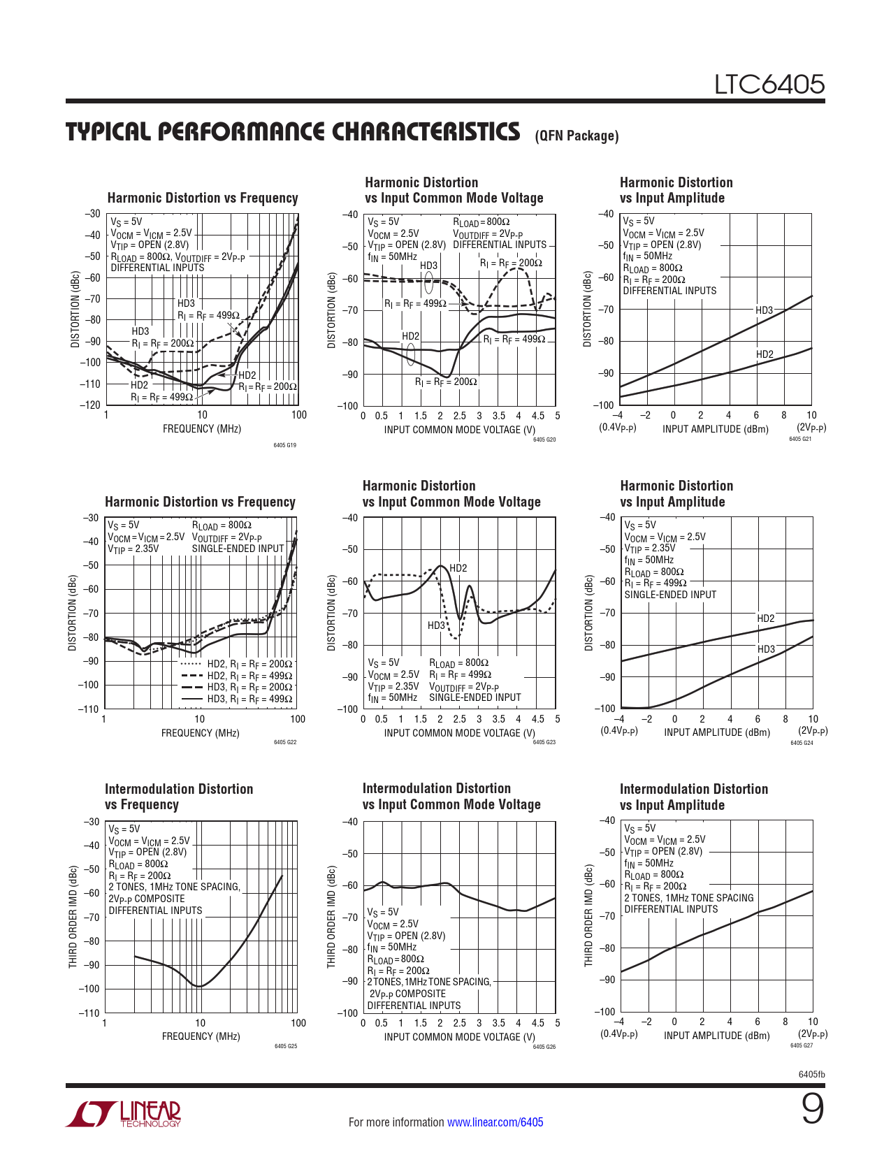 –30 –40 –40 VS = 5V VS = 5V RLOAD = 800Ω VS = 5V –40 VOCM = VICM = 2.5V VOCM = 2.5V VOUTDIFF = 2VP-P VOCM = VICM = 2.5V VTIP = OPEN (2.8V) –50 VTIP = OPEN (2.8V) DIFFERENTIAL INPUTS –50 VTIP = OPEN (2.8V) –50 RLOAD = 800Ω, VOUTDIFF = 2VP-P fIN = 50MHz fIN = 50MHz DIFFERENTIAL INPUTS HD3 RI = RF = 200Ω RLOAD = 800Ω –60 –60 –60 RI = RF = 200Ω DIFFERENTIAL INPUTS –70 HD3 R TION (dBc) I = RF = 499Ω TION (dBc) –70 TION (dBc) –70 HD3 –80 RI = RF = 499Ω HD3 HD2 DISTOR –90 R R I = RF = 200Ω DISTOR –80 I = RF = 499Ω DISTOR –80 HD2 –100 HD2 –90 –90 –110 HD2 R R I = RF = 200Ω I = RF = 200Ω R –120 I = RF = 499Ω –100 –100 1 10 100 0 0.5 1 1.5 2 2.5 3 3.5 4 4.5 5 –4 –2 0 2 4 6 8 10 FREQUENCY (MHz) INPUT COMMON MODE VOLTAGE (V) (0.4VP-P) INPUT AMPLITUDE (dBm) (2VP-P) 6405 G20 6405 G21 6405 G19