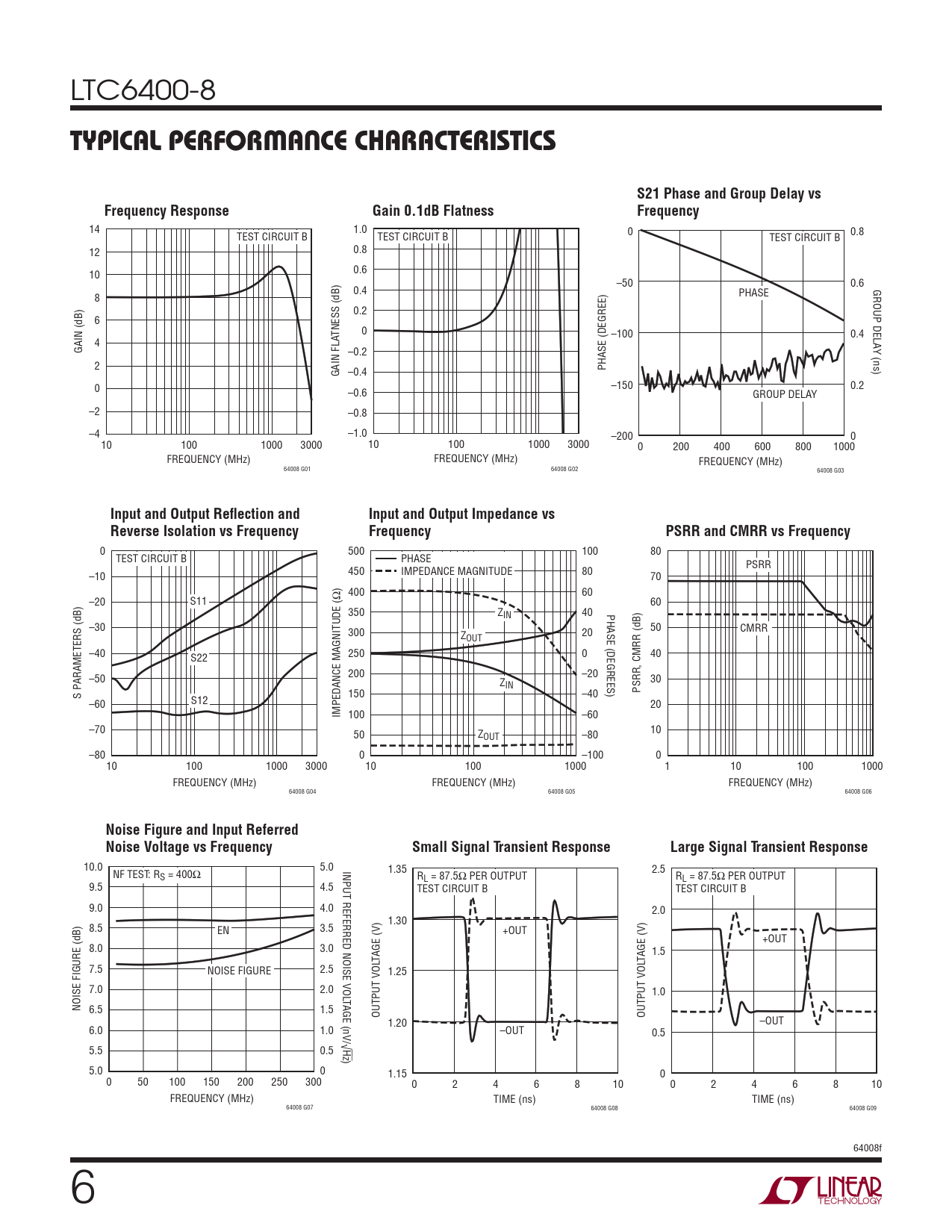 10.0 5.0 INPUT REFERRED NOISE VOL 1.35 2.5 NF TEST: RS = 400Ω R R L = 87.5Ω PER OUTPUT L = 87.5Ω PER OUTPUT 9.5 4.5 TEST CIRCUIT B TEST CIRCUIT B 9.0 4.0 2.0 1.30 8.5 3.5 EN +OUT +OUT 8.0 3.0 1.5 TAGE (V) TAGE (V) 7.5 NOISE FIGURE 2.5 1.25 7.0 2.0 1.0 TAGE (nV NOISE FIGURE (dB) 6.5 1.5 OUTPUT VOL OUTPUT VOL –OUT 1.20 6.0 1.0 –OUT 0.5 /√ Hz 5.5 0.5 ) 5.0 0 1.15 0 0 50 100 150 200 250 300 0 2 4 6 8 10 0 2 4 6 8 10 FREQUENCY (MHz) TIME (ns) TIME (ns) 64008 G07 64008 G08 64008 G09 64008f 6