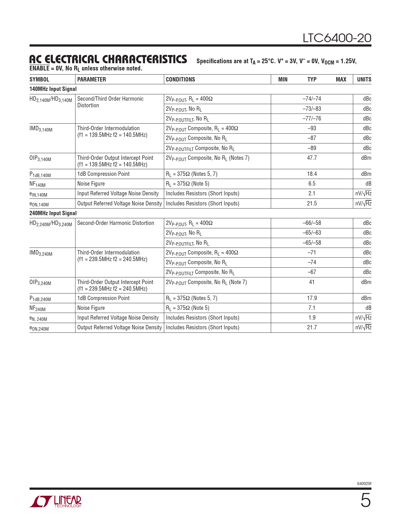 HD2,240M/HD3,240M Second-Order Harmonic Distortion 2VP-P,OUT, RL = 400Ω –66/–58 dBc 2VP-P,OUT, No RL –65/–63 dBc 2VP-P,OUTFILT, No RL –65/–58 dBc IMD3,240M Third-Order Intermodulation 2VP-P,OUT Composite, RL = 400Ω –71 dBc (f1 = 239.5MHz f2 = 240.5MHz) 2VP-P,OUT Composite, No RL –74 dBc 2VP-P,OUTFILT Composite, No RL –67 dBc OIP3,240M Third-Order Output Intercept Point 2VP-P,OUT Composite, No RL (Note 7) 41 dBm (f1 = 239.5MHz f2 = 240.5MHz) P1dB,240M 1dB Compression Point RL = 375Ω (Notes 5, 7) 17.9 dBm NF240M Noise Figure RL = 375Ω (Note 5) 7.1 dB eN, 240M Input Referred Voltage Noise Density Includes Resistors (Short Inputs) 1.9 nV/√Hz eON,240M Output Referred Voltage Noise Density Includes Resistors (Short Inputs) 21.7 nV/√Hz 640020f 5