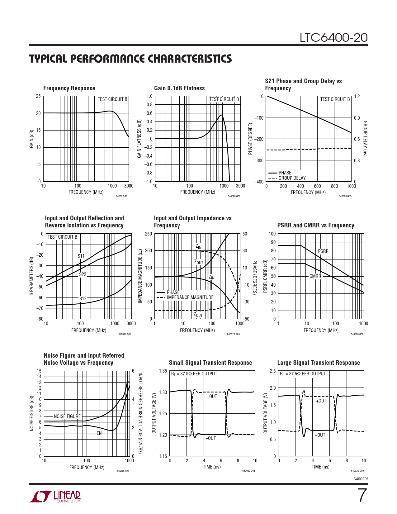 0 250 50 100 TEST CIRCUIT B –10 90 Z ) IN Ω 200 30 80 PSRR –20 S11 PHASE (DEGREES) 70 ZOUT –30 150 10 60 –40 S22 ZIN 50 CMRR 100 –10 –50 40 PHASE PSRR, CMRR (dB) S PARAMETERS (dB) 30 –60 IMPEDANCE MAGNITUDE S12 IMPEDANCE MAGNITUDE ( 50 –30 20 –70 10 ZOUT –80 0 –50 0 10 100 1000 3000 1 10 100 1000 1 10 100 1000 FREQUENCY (MHz) FREQUENCY (MHz) FREQUENCY (MHz) 640020 G04 640020 G05 640020 G06