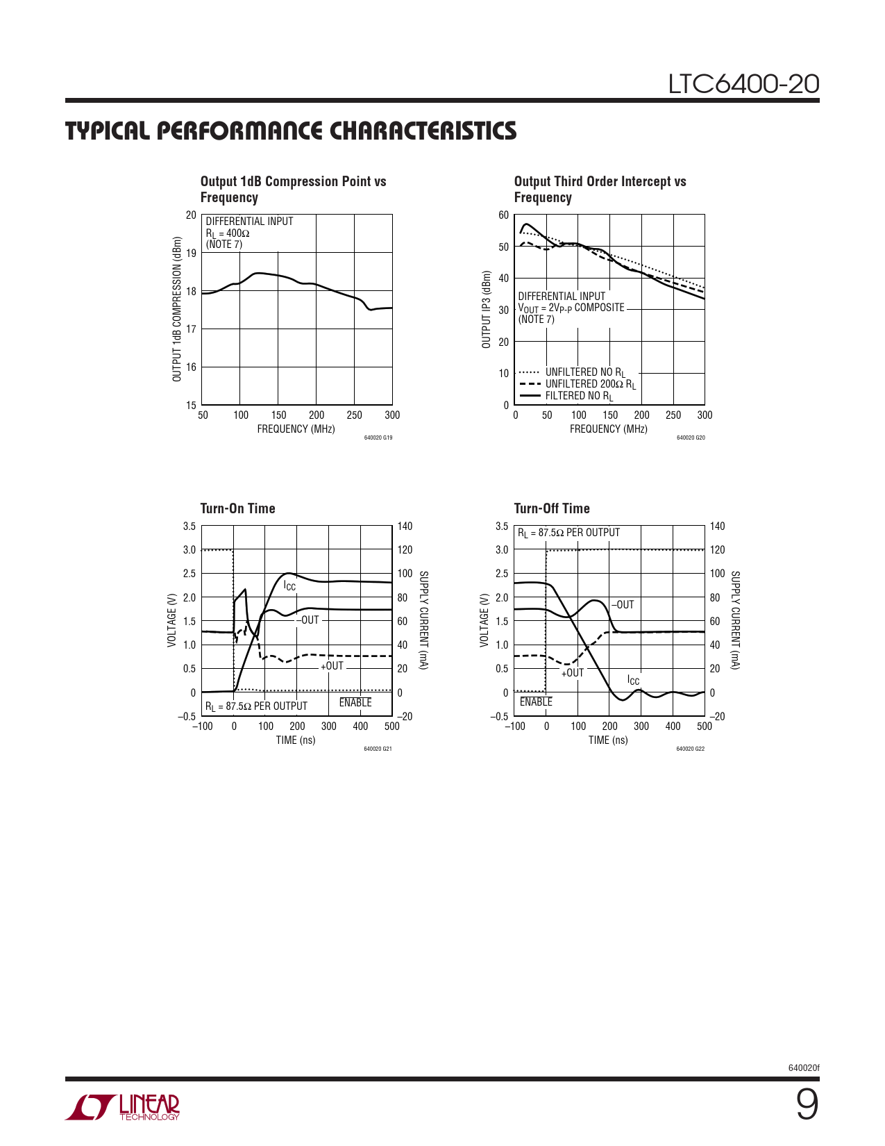 20 60 DIFFERENTIAL INPUT RL = 400Ω (NOTE 7) 50 19 40 18 DIFFERENTIAL INPUT 30 VOUT = 2VP-P COMPOSITE (NOTE 7) 17 OUTPUT IP3 (dBm) 20 16 10 UNFILTERED NO R OUTPUT 1dB COMPRESSION (dBm) L UNFILTERED 200Ω RL FILTERED NO RL 15 0 50 100 150 200 250 300 0 50 100 150 200 250 300 FREQUENCY (MHz) FREQUENCY (MHz) 640020 G19 640020 G20