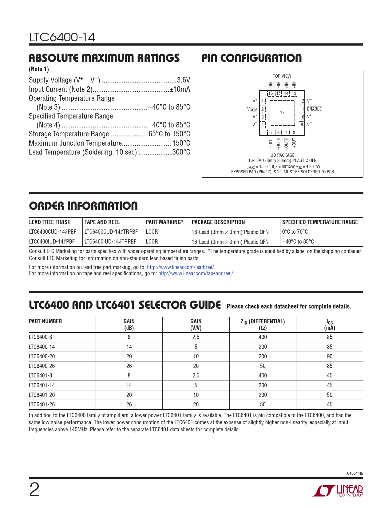 LTC6400CUD-14#PBF LTC6400CUD-14#TRPBF LCCR 16-Lead (3mm × 3mm) Plastic QFN 0°C to 70°C LTC6400IUD-14#PBF LTC6400IUD-14#TRPBF LCCR 16-Lead (3mm × 3mm) Plastic QFN – 40°C to 85°C Consult LTC Marketing for parts specifi ed with wider operating temperature ranges. *The temperature grade is identifi ed by a label on the shipping container. Consult LTC Marketing for information on non-standard lead based fi nish parts. For more information on lead free part marking, go to: http://www.linear.com/leadfree/ For more information on tape and reel specifi cations, go to: http://www.linear.com/tapeandreel/