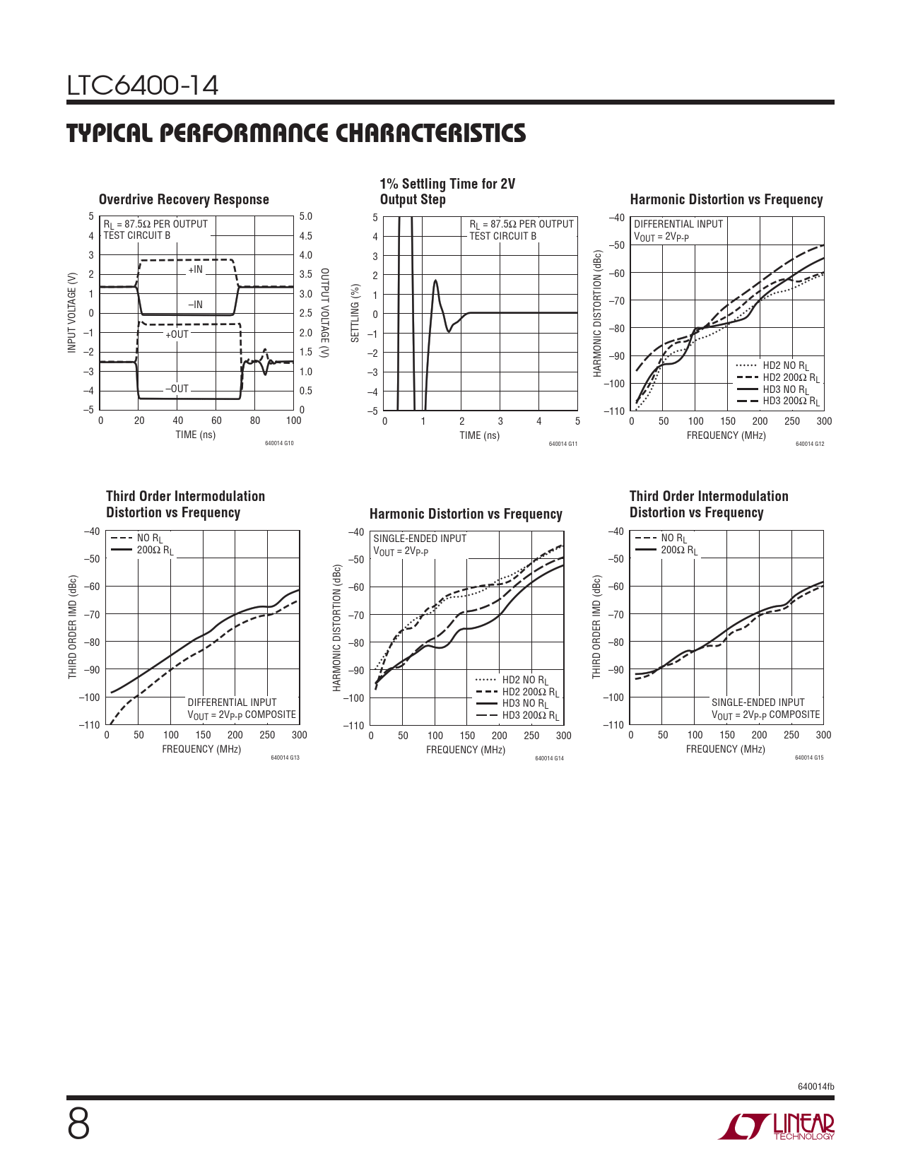 –40 –40 –40 NO RL SINGLE-ENDED INPUT NO RL 200Ω RL VOUT = 2VP-P 200Ω RL –50 –50 –50 –60 –60 –60 TION (dBc) –70 –70 –70 –80 –80 –80 –90 –90 –90 THIRD ORDER IMD (dBc) HD2 NO R THIRD ORDER IMD (dBc) L HARMONIC DISTOR HD2 200Ω R –100 L –100 DIFFERENTIAL INPUT –100 HD3 NO RL SINGLE-ENDED INPUT VOUT = 2VP-P COMPOSITE HD3 200Ω RL VOUT = 2VP-P COMPOSITE –110 –110 –110 0 50 100 150 200 250 300 0 50 100 150 200 250 300 0 50 100 150 200 250 300 FREQUENCY (MHz) FREQUENCY (MHz) FREQUENCY (MHz) 640014 G13 640014 G14 640014 G15 640014fb 8