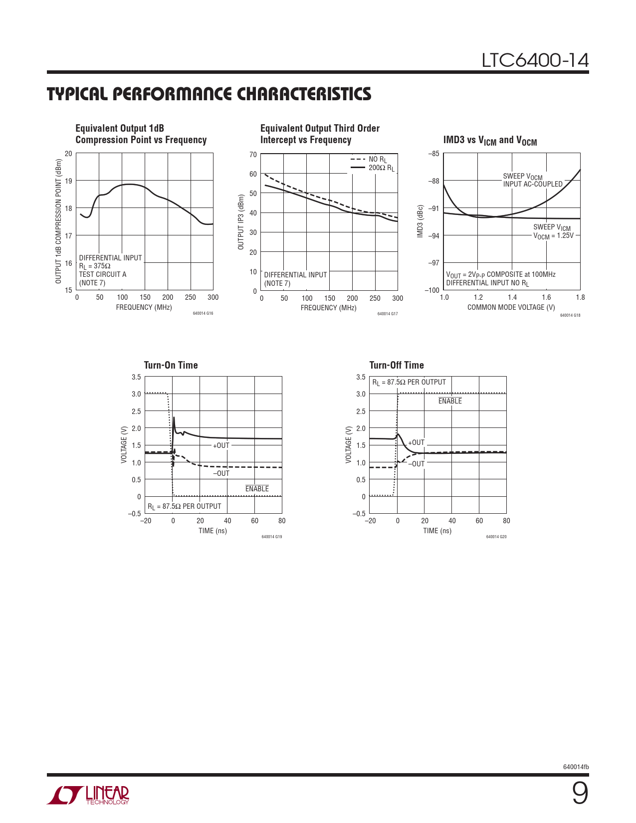 20 70 –85 NO RL 200Ω RL 60 SWEEP V 19 –88 OCM INPUT AC-COUPLED 50 18 –91 40 SWEEP VICM 17 30 IMD3 (dBc) –94 VOCM = 1.25V OUTPUT IP3 (dBm) 20 DIFFERENTIAL INPUT 16 –97 RL = 375Ω TEST CIRCUIT A 10 DIFFERENTIAL INPUT VOUT = 2VP-P COMPOSITE at 100MHz OUTPUT 1dB COMPRESSION POINT (dBm) (NOTE 7) (NOTE 7) DIFFERENTIAL INPUT NO RL 15 0 –100 0 50 100 150 200 250 300 0 50 100 150 200 250 300 1.0 1.2 1.4 1.6 1.8 FREQUENCY (MHz) FREQUENCY (MHz) COMMON MODE VOLTAGE (V) 640014 G16 640014 G17 640014 G18