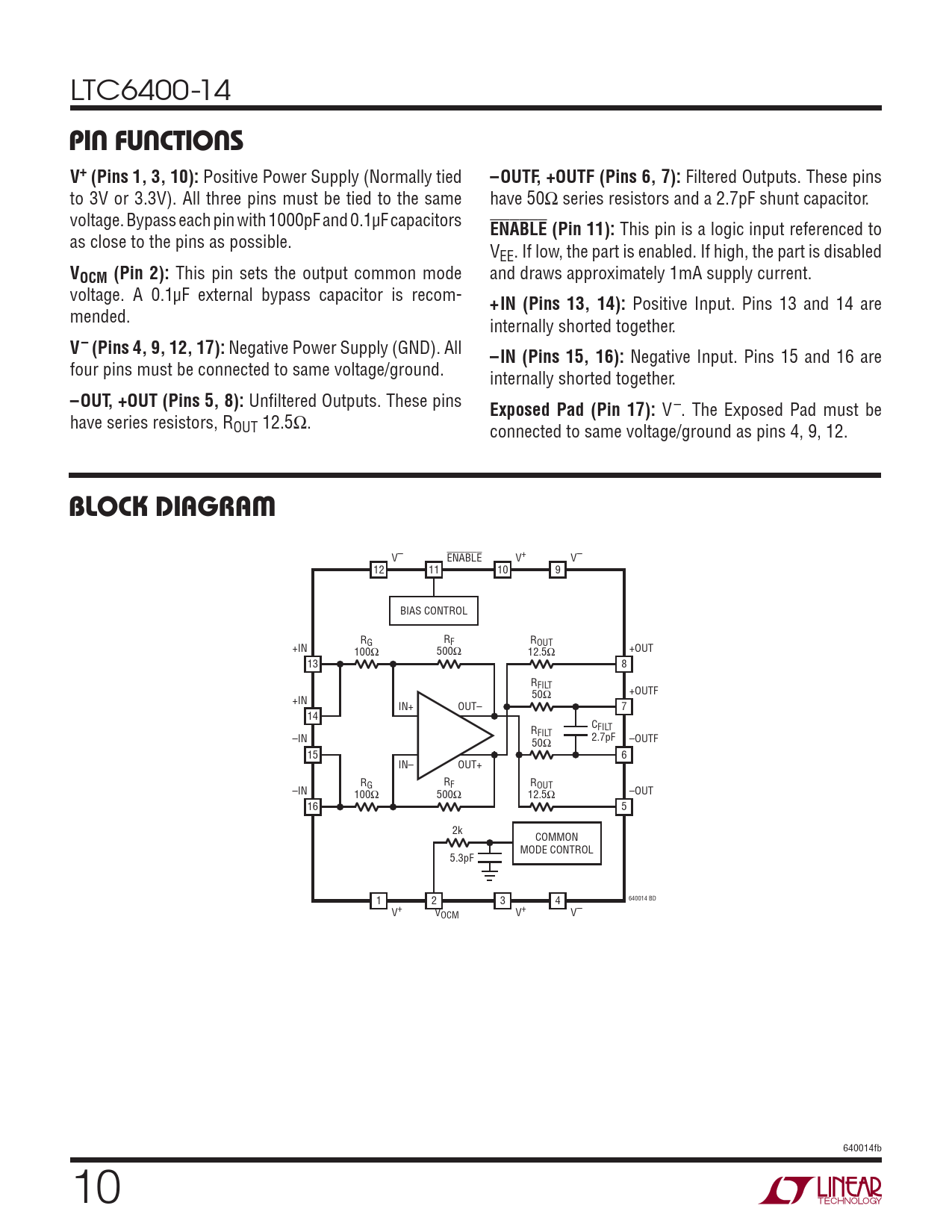 PIN FUNCTIONS. V+ (Pins 1, 3, 10):. –OUTF, +OUTF (Pins 6, 7):. ENABLE (Pin 11):. VOCM (Pin 2):. +IN (Pins 13, 14):