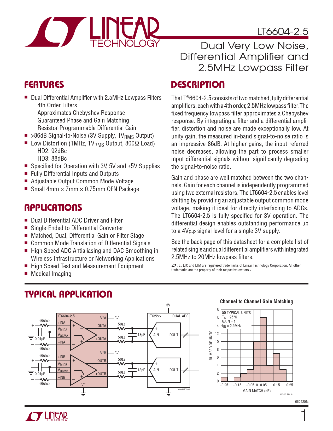 voltage, making it ideal for directly interfacing to ADCs. The LT6604-2.5 is fully specifi ed for 3V operation. The n Dual Differential ADC Driver and Filter differential design enables outstanding performance up n Single-Ended to Differential Converter to a 4VP-P signal level for a single 3V supply. n Matched, Dual, Differential Gain or Filter Stage n See the back page of this datasheet for a complete list of Common Mode Translation of Differential Signals n related single and dual differential amplifi ers with integrated High Speed ADC Antialiasing and DAC Smoothing in 2.5MHz to 20MHz lowpass fi lters. Wireless Infrastructure or Networking Applications n L, LT, LTC and LTM are registered trademarks of Linear Technology Corporation. All other High Speed Test and Measurement Equipment trademarks are the property of their respective owners.v n Medical Imaging