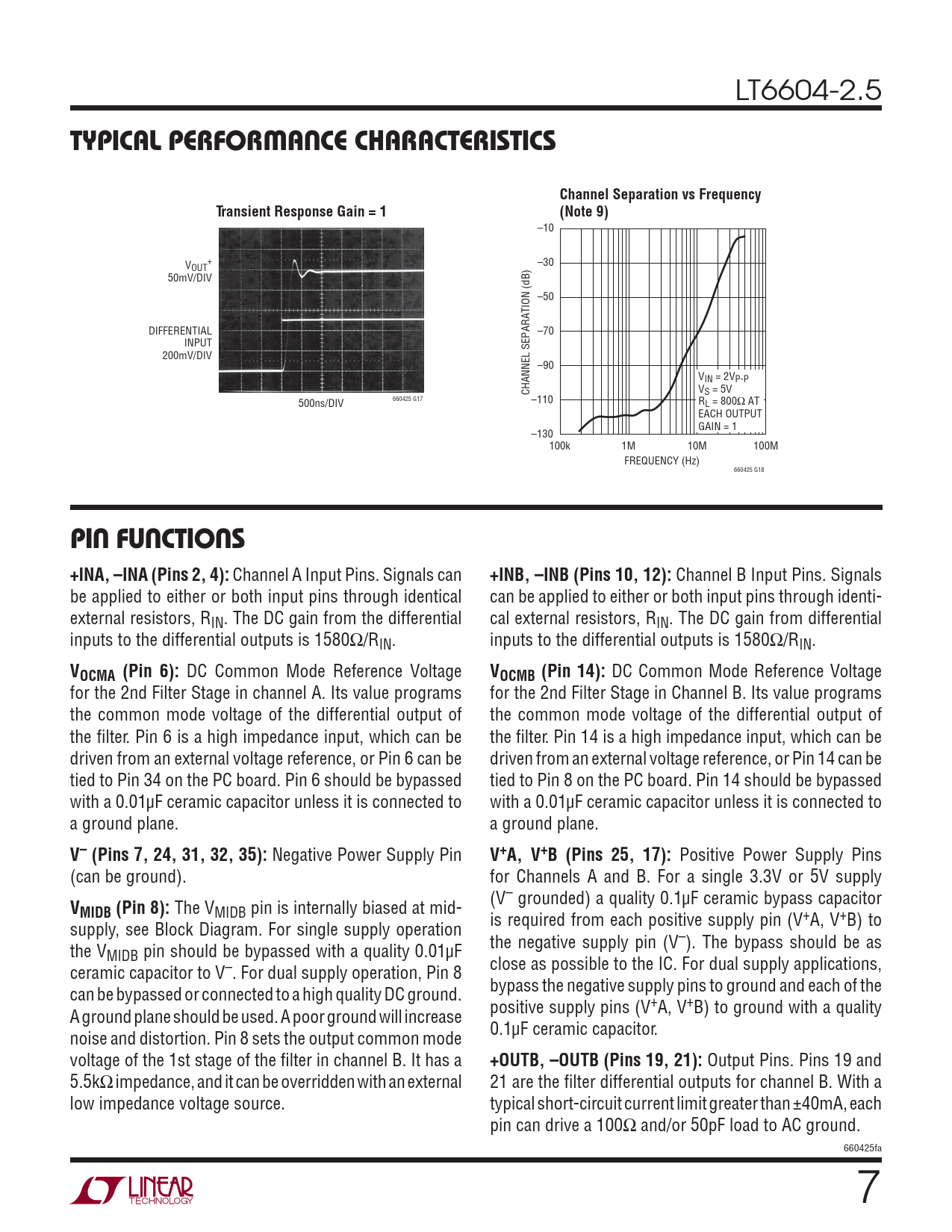 TYPICAL PERFORMANCE CHARACTERISTICS. Channel Separation vs Frequency. Transient Response Gain = 1. (Note 9). PIN FUNCTIONS