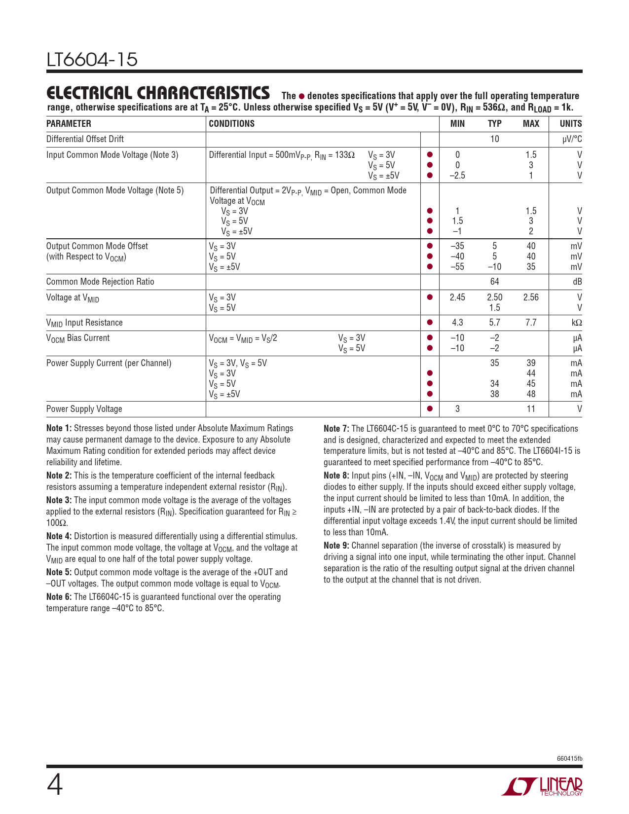 LT6604-15 ELECTRICAL CHARACTERISTICSThe l denotes specifi cations that apply over the full operating temperaturerange, otherwise specifi cations are at TA = 25°C. Unless otherwise specifi ed VS = 5V (V+ = 5V, V– = 0V), RIN = 536Ω, and RLOAD = 1k.PARAMETERCONDITIONSMINTYPMAXUNITS Differential Offset Drift 10 μV/°C Input Common Mode Voltage (Note 3) Differential Input = 500mVP-P, RIN = 133Ω VS = 3V l 0 1.5 V VS = 5V l 0 3 V VS = ±5V l –2.5 1 V Output Common Mode Voltage (Note 5) Differential Output = 2VP-P, VMID = Open, Common Mode Voltage at VOCM VS = 3V l 1 1.5 V VS = 5V l 1.5 3 V VS = ±5V l –1 2 V Output Common Mode Offset VS = 3V l –35 5 40 mV (with Respect to VOCM) VS = 5V l –40 5 40 mV VS = ±5V l –55 –10 35 mV Common Mode Rejection Ratio 64 dB Voltage at VMID VS = 3V l 2.45 2.50 2.56 V VS = 5V 1.5 V VMID Input Resistance l 4.3 5.7 7.7 kΩ VOCM Bias Current VOCM = VMID = VS/2 VS = 3V l –10 –2 μA VS = 5V l –10 –2 μA Power Supply Current (per Channel) VS = 3V, VS = 5V 35 39 mA VS = 3V l 44 mA VS = 5V l 34 45 mA VS = ±5V l 38 48 mA Power Supply Voltage l 3 11 V Note 1: Stresses beyond those listed under Absolute Maximum Ratings Note 7: The LT6604C-15 is guaranteed to meet 0°C to 70°C specifi cations may cause permanent damage to the device. Exposure to any Absolute and is designed, characterized and expected to meet the extended Maximum Rating condition for extended periods may affect device temperature limits, but is not tested at –40°C and 85°C. The LT6604I-15 is reliability and lifetime. guaranteed to meet specifi ed performance from –40°C to 85°C. Note 2: This is the temperature coeffi cient of the internal feedback Note 8: Input pins (+IN, –IN, VOCM and VMID) are protected by steering resistors assuming a temperature independent external resistor (RIN). diodes to either supply. If the inputs should exceed either supply voltage, Note 3: The input common mode voltage is the average of the voltages the input current should be limited to less than 10mA. In addition, the applied to the external resistors (R inputs +IN, –IN are protected by a pair of back-to-back diodes. If the IN). Specifi cation guaranteed for RIN ≥ 100Ω. differential input voltage exceeds 1.4V, the input current should be limited Note 4: Distortion is measured differentially using a differential stimulus. to less than 10mA. The input common mode voltage, the voltage at V Note 9: Channel separation (the inverse of crosstalk) is measured by OCM, and the voltage at V driving a signal into one input, while terminating the other input. Channel MID are equal to one half of the total power supply voltage. Note 5: Output common mode voltage is the average of the +OUT and separation is the ratio of the resulting output signal at the driven channel –OUT voltages. The output common mode voltage is equal to V to the output at the channel that is not driven. OCM. Note 6: The LT6604C-15 is guaranteed functional over the operating temperature range –40°C to 85°C. 660415fb 4