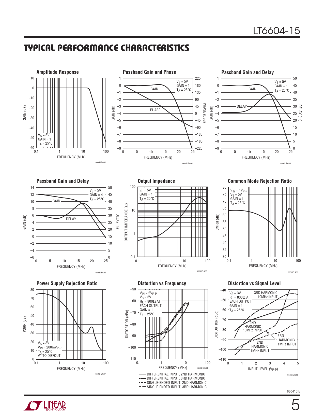 14 50 100 80 VS = 5V VS = 5V VIN = 1VP-P 12 GAIN = 4 45 GAIN = 1 75 VS = 5V T TA = 25°C GAIN = 1 10 A = 25°C GAIN 40 70 TA = 25°C 8 35 65 10 DELAY 6 30 60 DELAY 4 25 ( 55 ns GAIN (dB) 2 20 CMRR (dB) 50 1 0 15 45 OUTPUT IMPEDANCE (Ω) –2 10 40 –4 5 35 –6 0 0.1 30 0 5 10 15 20 25 0.1 1 10 100 0.1 1 10 100 FREQUENCY (MHz) FREQUENCY (MHz) FREQUENCY (MHz) 660415 G05 660415 G04 660415 G06