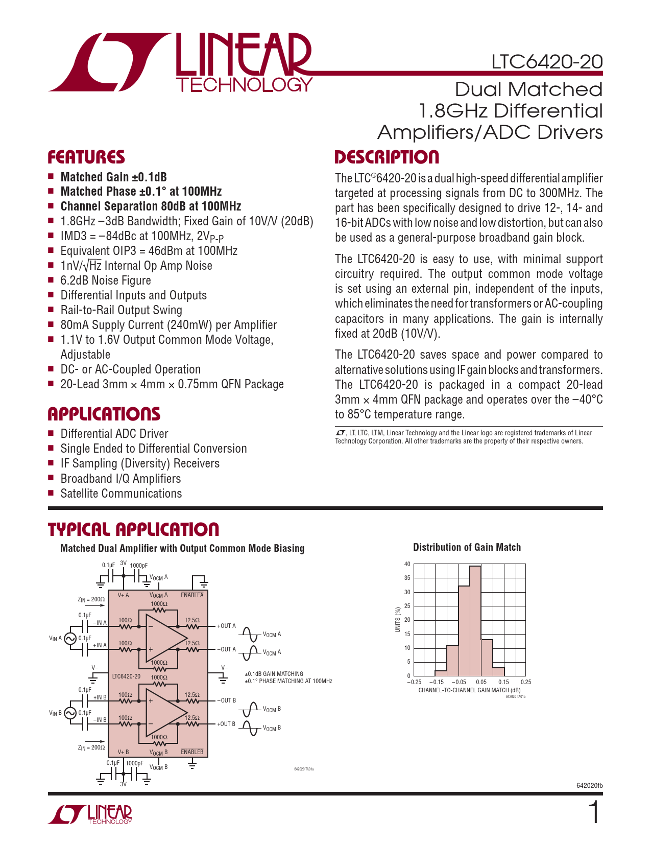 LTC6420-20 Dual Matched 1.8GHz Differential Amplifi ers/ADC Drivers FEATURESDESCRIPTION n Matched Gain ±0.1dB The LTC®6420-20 is a dual high-speed differential amplifi er n Matched Phase ±0.1° at 100MHz targeted at processing signals from DC to 300MHz. The n Channel Separation 80dB at 100MHz part has been specifi cally designed to drive 12-, 14- and n 1.8GHz –3dB Bandwidth; Fixed Gain of 10V/V (20dB) 16-bit ADCs with low noise and low distortion, but can also n IMD3 = –84dBc at 100MHz, 2VP-P be used as a general-purpose broadband gain block. n Equivalent OIP3 = 46dBm at 100MHz The LTC6420-20 is easy to use, with minimal support n 1nV/√Hz Internal Op Amp Noise circuitry required. The output common mode voltage n 6.2dB Noise Figure is set using an external pin, independent of the inputs, n Differential Inputs and Outputs which eliminates the need for transformers or AC-coupling n Rail-to-Rail Output Swing capacitors in many applications. The gain is internally n 80mA Supply Current (240mW) per Amplifi er fi xed at 20dB (10V/V). n 1.1V to 1.6V Output Common Mode Voltage, Adjustable The LTC6420-20 saves space and power compared to n DC- or AC-Coupled Operation alternative solutions using IF gain blocks and transformers. n 20-Lead 3mm × 4mm × 0.75mm QFN Package The LTC6420-20 is packaged in a compact 20-lead 3mm × 4mm QFN package and operates over the –40°C APPLICATIONS to 85°C temperature range. n Differential ADC Driver L, LT, LTC, LTM, Linear Technology and the Linear logo are registered trademarks of Linear Technology Corporation. All other trademarks are the property of their respective owners. n Single Ended to Differential Conversion n IF Sampling (Diversity) Receivers n Broadband I/Q Amplifi ers n Satellite Communications TYPICAL APPLICATIONMatched Dual Amplifi er with Output Common Mode BiasingDistribution of Gain Match 0.1μF 3V 40 1000pF VOCM A 35 30 V+ A VOCM A ENABLEA ZIN = 200Ω 1000Ω 25 0.1μF 100Ω – 12.5Ω 20 –IN A +OUT A UNITS (%) V 15 OCM A VIN A 0.1μF +IN A 100Ω 12.5Ω + 10 –OUT A VOCM A 1000Ω 5 V– V– ±0.1dB GAIN MATCHING LTC6420-20 0 1000Ω ±0.1° PHASE MATCHING AT 100MHz – 0.25 – 0.15 – 0.05 0.05 0.15 0.25 0.1μF CHANNEL-TO-CHANNEL GAIN MATCH (dB) 100Ω 12.5Ω 642020 TA01b +IN B + – OUT B V VIN B 0.1μF OCM B –IN B 100Ω 12.5Ω – +OUT B VOCM B 1000Ω ZIN = 200Ω V+ B VOCM B ENABLEB 0.1μF 1000pF VOCM B 642020 TA01a 3V 642020fb 1 Document Outline FEATURES DESCRIPTION APPLICATIONS TYPICAL APPLICATION ABSOLUTE MAXIMUM RATINGS PIN CONFIGURATION ORDER INFORMATION SELECTOR GUIDE DC ELECTRICAL CHARACTERISTICS AC ELECTRICAL CHARACTERISTICS TYPICAL PERFORMANCE CHARACTERISTICS PIN FUNCTIONS BLOCK DIAGRAM APPLICATIONS INFORMATION TYPICAL APPLICATIONS PACKAGE DESCRIPTION REVISION HISTORY TYPICAL APPLICATION RELATED PARTS