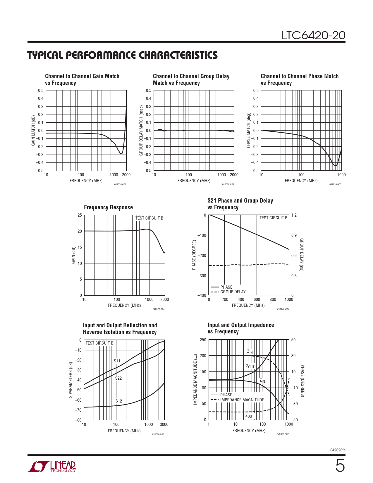 25 0 1.2 TEST CIRCUIT B TEST CIRCUIT B 20 –100 0.9 GROUP DELA 15 –200 0.6 Y (ns) GAIN (dB) 10 PHASE (DEGREE) –300 0.3 5 PHASE GROUP DELAY 0 –400 0 10 100 1000 3000 0 200 400 600 800 1000 FREQUENCY (MHz) FREQUENCY (MHz) 642020 G04 642020 G05