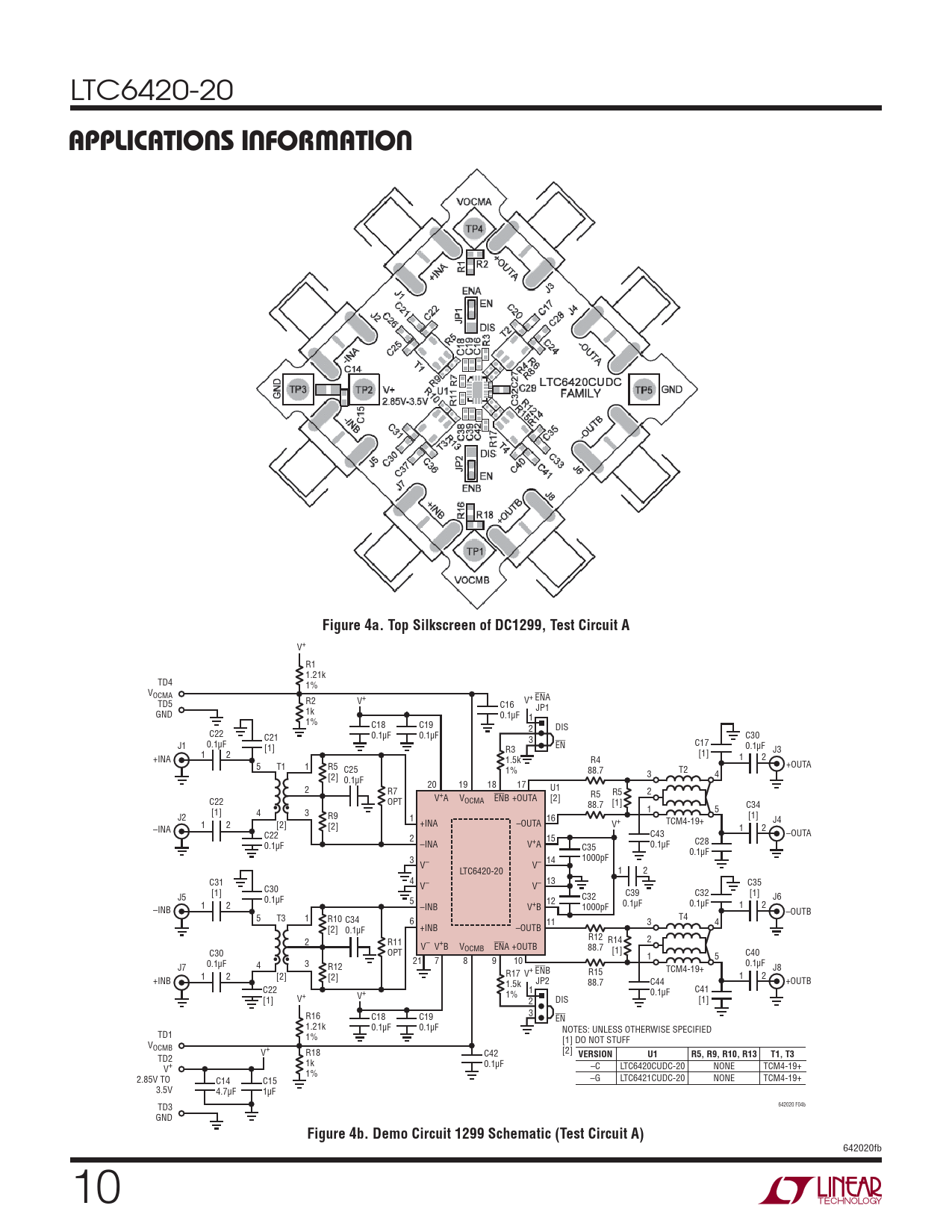 1k 0.1μF V+ –C LTC6420CUDC-20 NONE TCM4-19+ 1% 2.85V TO C14 C15 –G LTC6421CUDC-20 NONE TCM4-19+ 3.5V 4.7μF 1μF 642020 F04b TD3 GND