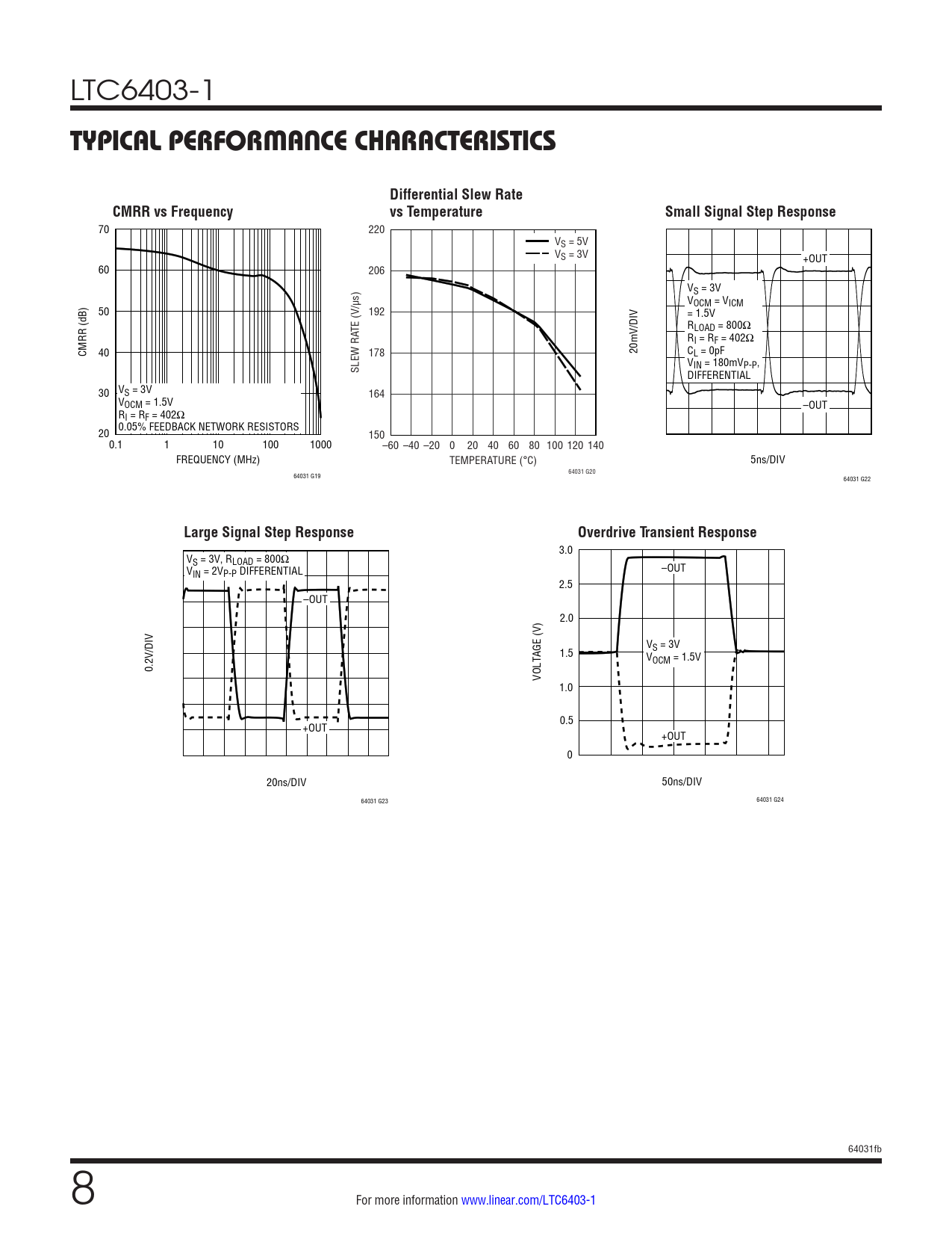 3.0 VS = 3V, RLOAD = 800Ω V –OUT IN = 2VP-P DIFFERENTIAL 2.5 –OUT 2.0 V 1.5 S = 3V VOCM = 1.5V 0.2V/DIV VOLTAGE (V) 1.0 0.5 +OUT +OUT 0 20ns/DIV 50ns/DIV 64031 G23 64031 G24 64031fb 8 For more information www.linear.com/LTC6403-1
