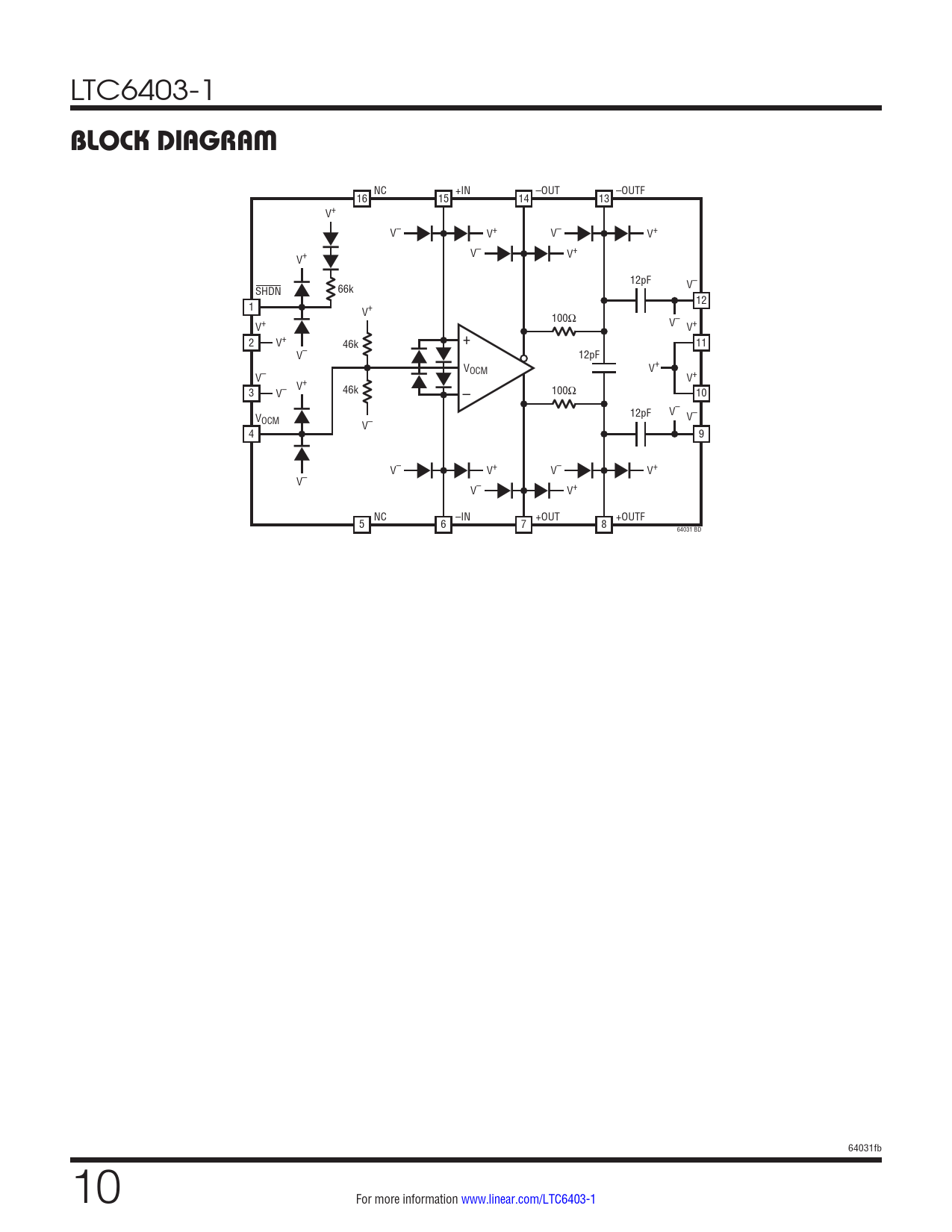 NC +IN –OUT –OUTF 16 15 14 13 V+ V+ V– V+ V– V+ V+ V– 12pF 66k V– SHDN 1 12 V+ 100Ω V+ V– V+ 2 V+ 46k + 11 V– 12pF VOCM V+ V– V+ 3 V+ V– 46k – 100Ω 10 12pF V– VOCM V– V– 4 9 V– V+ V+ V– V– V+ V– NC –IN +OUT +OUTF 5 6 7 8 64031 BD 64031fb 10 For more information www.linear.com/LTC6403-1