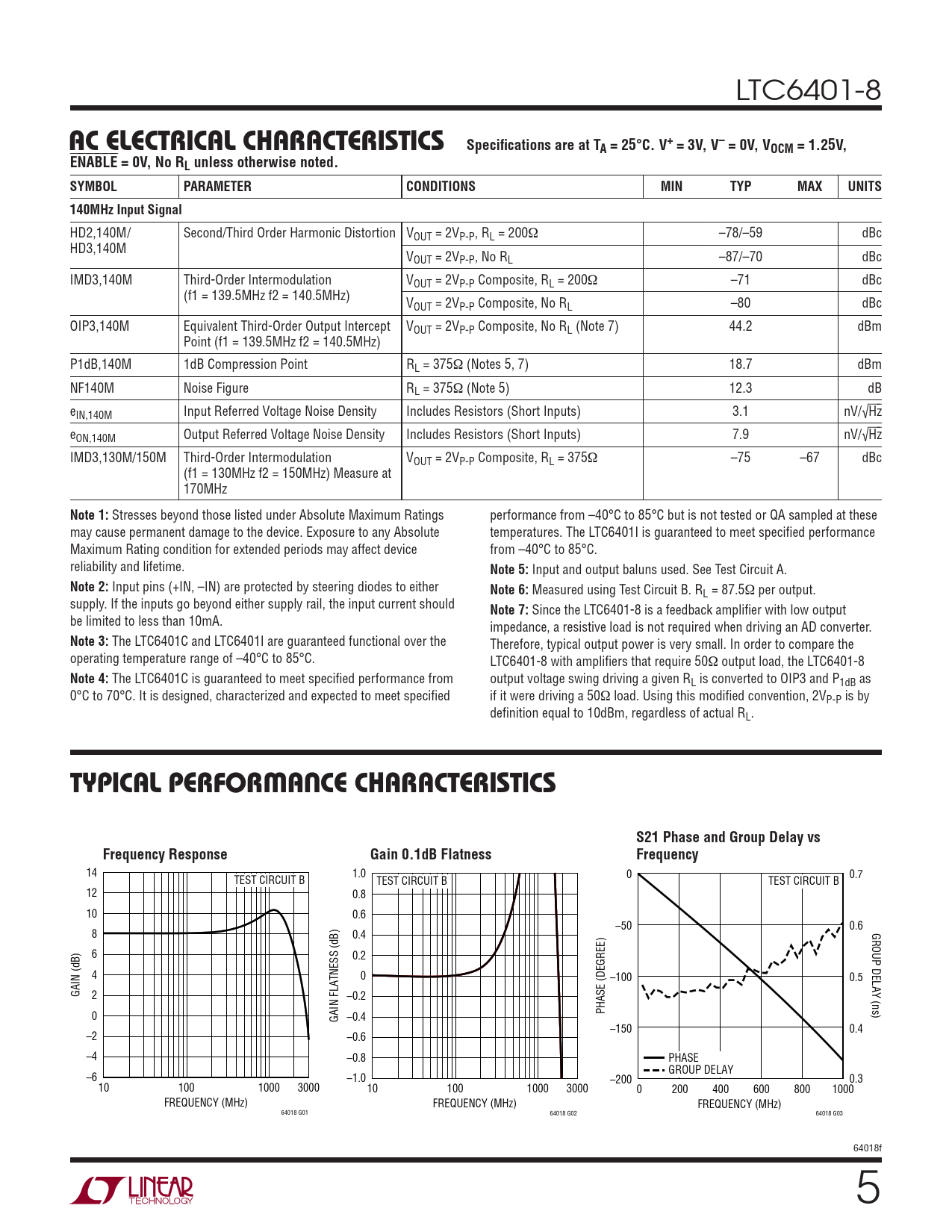14 1.0 0 0.7 TEST CIRCUIT B TEST CIRCUIT B TEST CIRCUIT B 12 0.8 10 0.6 –50 0.6 GROUP DELAY (ns) 8 0.4 6 0.2 4 0 –100 0.5 GAIN (dB) 2 –0.2 PHASE (DEGREE) 0 GAIN FLATNESS (dB) –0.4 –150 0.4 –2 –0.6 –4 –0.8 PHASE GROUP DELAY –6 –1.0 –200 0.3 10 100 1000 3000 10 100 1000 3000 0 200 400 600 800 1000 FREQUENCY (MHz) FREQUENCY (MHz) FREQUENCY (MHz) 64018 G01 64018 G02 64018 G03 64018f 5