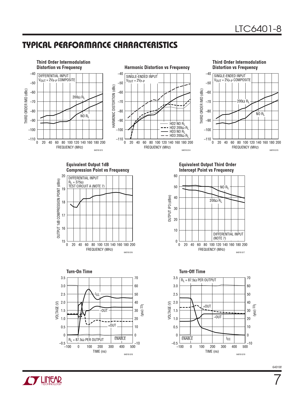 20 60 DIFFERENTIAL INPUT RL = 375Ω TEST CIRCUIT A (NOTE 7) 50 NO R 19 L 40 18 200Ω RL 30 17 OUTPUT IP3 (dBm) 20 16 10 DIFFERENTIAL INPUT OUTPUT 1dB COMPRESSION POINT (dBm) (NOTE 7) 15 0 0 20 40 60 80 100 120 140 160 180 200 0 20 40 60 80 100 120 140 160 180 200 FREQUENCY (MHz) FREQUENCY (MHz) 64018 G16 64018 G17