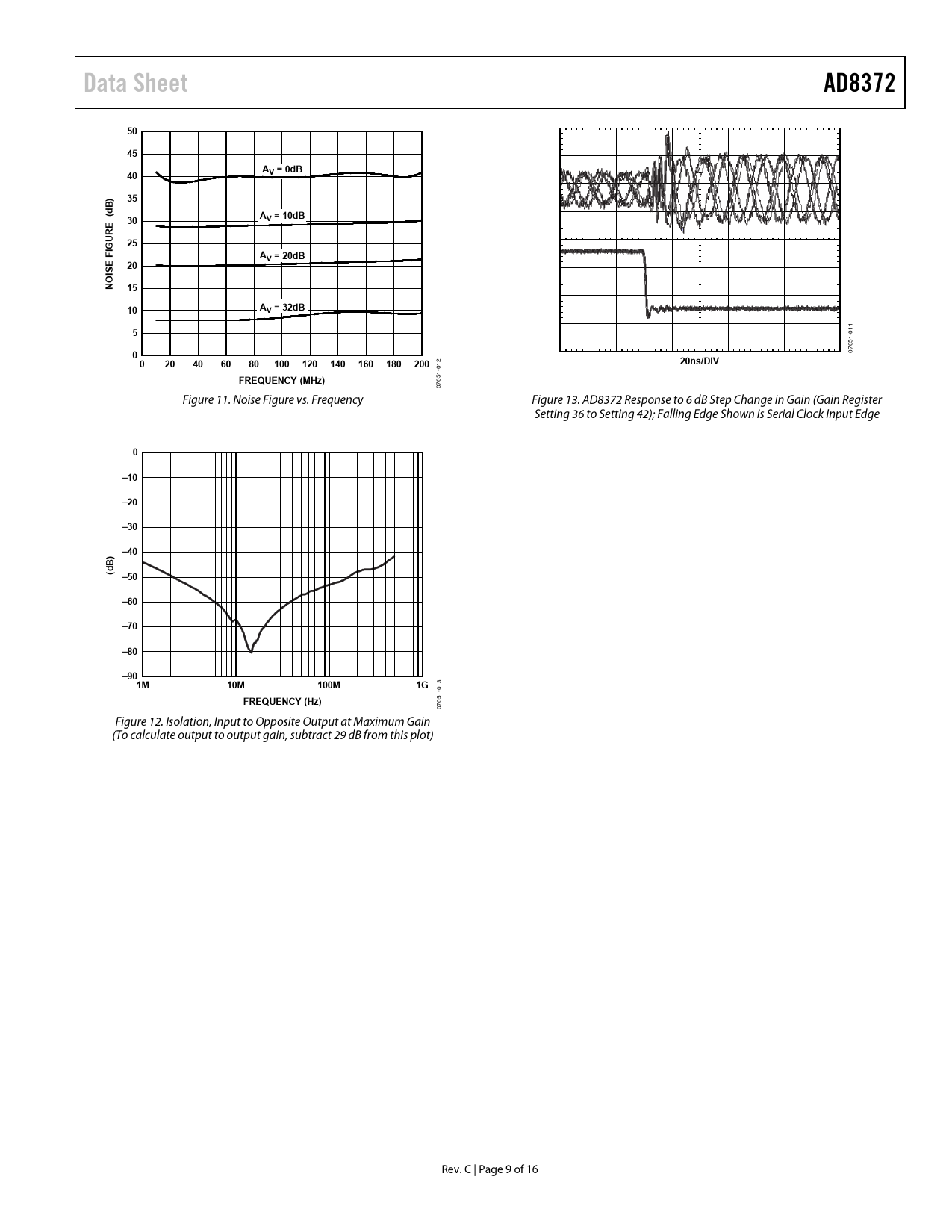 Data Sheet. AD8372. V = 0dB. B) d (. AV = 10dB. E UR. IG F. AV = 20dB. IS NO. AV = 32dB. 100. 120. 140. 160. 180. 200. 20ns/DIV. FREQUENCY (MHz). –10. –20. –30