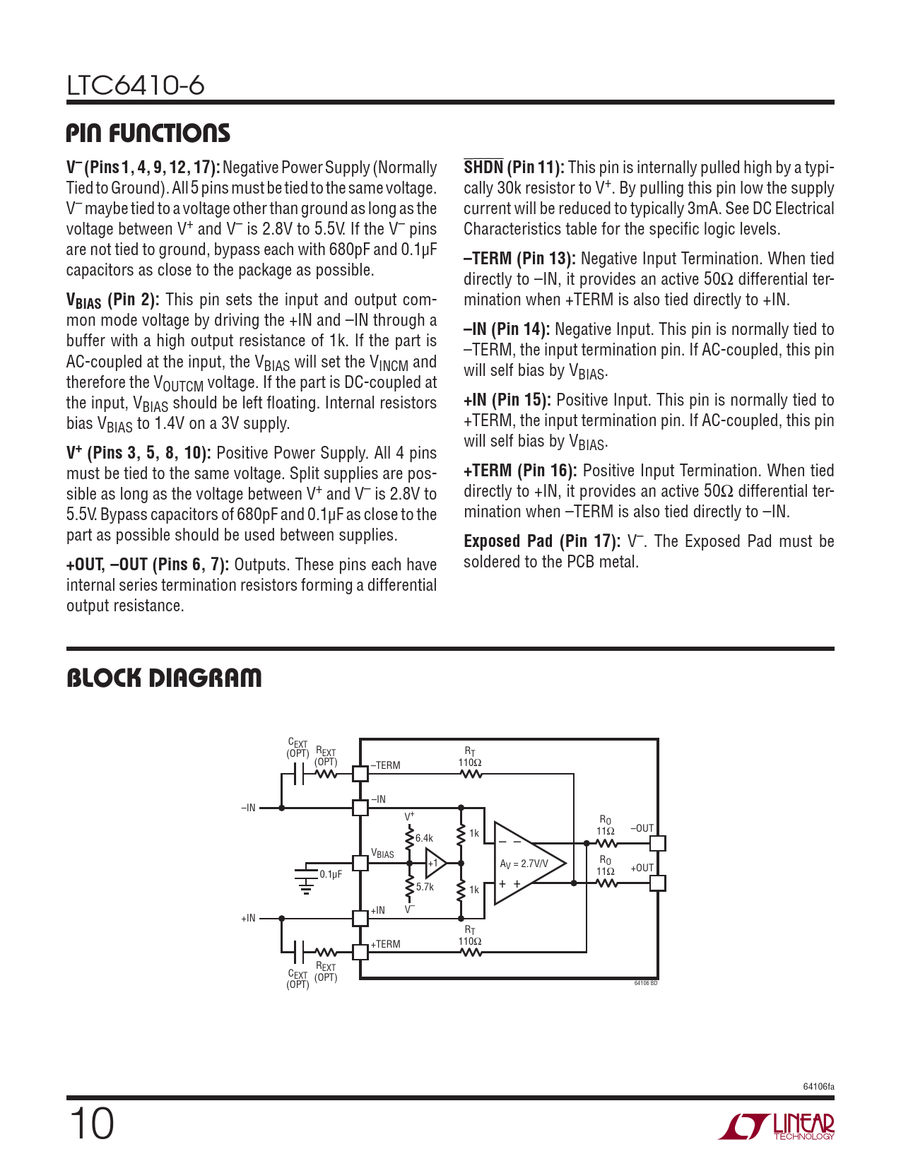PIN FUNCTIONS. V– (Pins 1, 4, 9, 12, 17):. SHDN (Pin 11):. –TERM (Pin 13):. VBIAS (Pin 2):. –IN (Pin 14):. +IN (Pin 15):