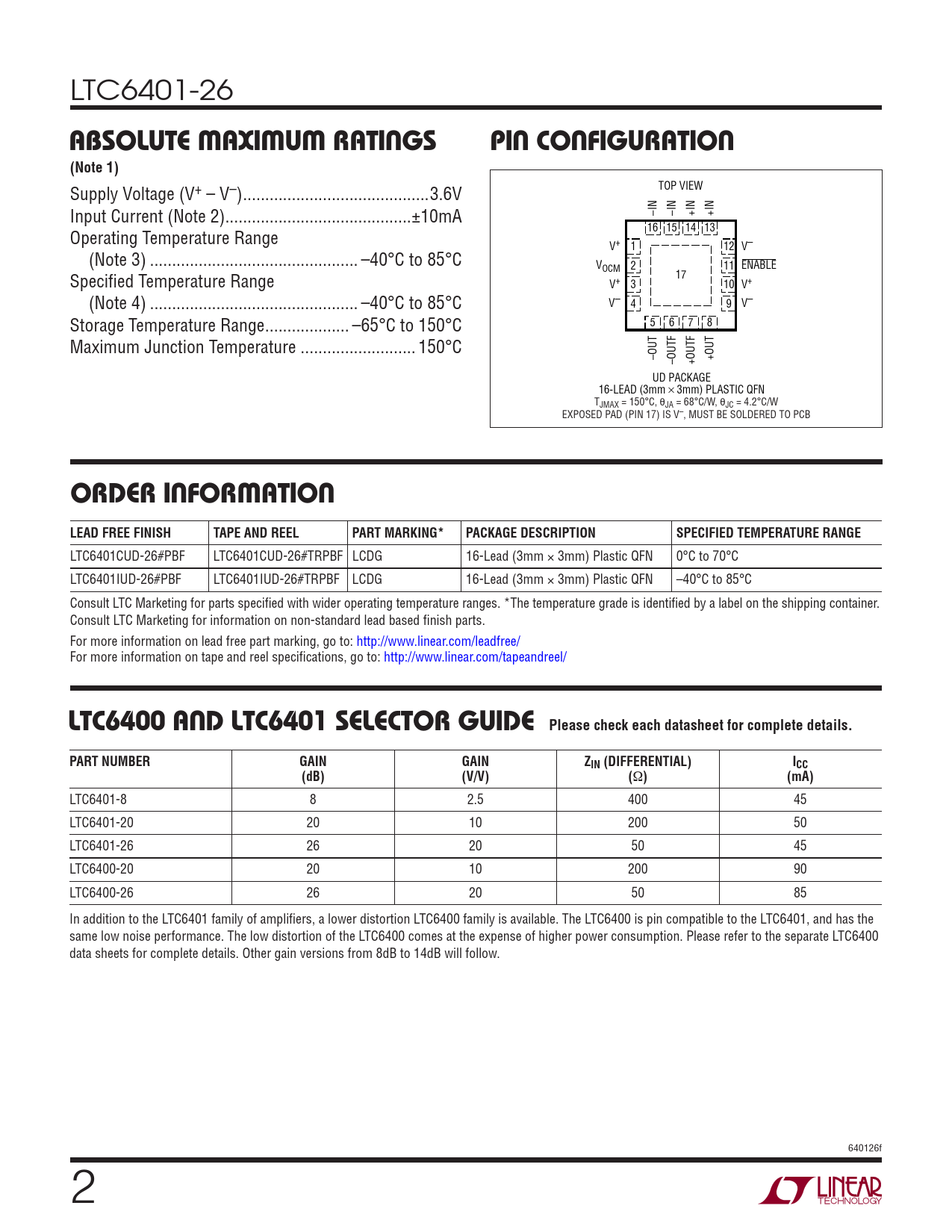 LTC6401-26 ABSOLUTE MAXIMUM RATINGSPIN CONFIGURATION(Note 1) TOP VIEW Supply Voltage (V+ – V–) ..3.6V Input Current (Note 2) ..±10mA –IN –IN +IN +IN 16 15 14 13 Operating Temperature Range V+ 1 12 V– (Note 3) ... –40°C to 85°C V 2 11 OCM ENABLE Specifi ed Temperature Range 17 V+ 3 10 V+ (Note 4) ... –40°C to 85°C V– 4 9 V– Storage Temperature Range ... –65°C to 150°C 5 6 7 8 Maximum Junction Temperature .. 150°C –OUT –OUTF +OUTF +OUT UD PACKAGE 16-LEAD (3mm × 3mm) PLASTIC QFN TJMAX = 150°C, θJA = 68°C/W, θJC = 4.2°C/W EXPOSED PAD (PIN 17) IS V–, MUST BE SOLDERED TO PCB ORDER INFORMATIONLEAD FREE FINISHTAPE AND REELPART MARKING*PACKAGE DESCRIPTIONSPECIFIED TEMPERATURE RANGE LTC6401CUD-26#PBF LTC6401CUD-26#TRPBF LCDG 16-Lead (3mm × 3mm) Plastic QFN 0°C to 70°C LTC6401IUD-26#PBF LTC6401IUD-26#TRPBF LCDG 16-Lead (3mm × 3mm) Plastic QFN –40°C to 85°C Consult LTC Marketing for parts specifi ed with wider operating temperature ranges. *The temperature grade is identifi ed by a label on the shipping container. Consult LTC Marketing for information on non-standard lead based fi nish parts. For more information on lead free part marking, go to: http://www.linear.com/leadfree/ For more information on tape and reel specifi cations, go to: http://www.linear.com/tapeandreel/ LTC6400 AND LTC6401 SELECTOR GUIDE Please check each datasheet for complete details.PART NUMBERGAINGAINZIN (DIFFERENTIAL)ICC(dB)(V/V)( Ω )(mA) LTC6401-8 8 2.5 400 45 LTC6401-20 20 10 200 50 LTC6401-26 26 20 50 45 LTC6400-20 20 10 200 90 LTC6400-26 26 20 50 85 In addition to the LTC6401 family of amplifi ers, a lower distortion LTC6400 family is available. The LTC6400 is pin compatible to the LTC6401, and has the same low noise performance. The low distortion of the LTC6400 comes at the expense of higher power consumption. Please refer to the separate LTC6400 data sheets for complete details. Other gain versions from 8dB to 14dB will follow. 640126f 2