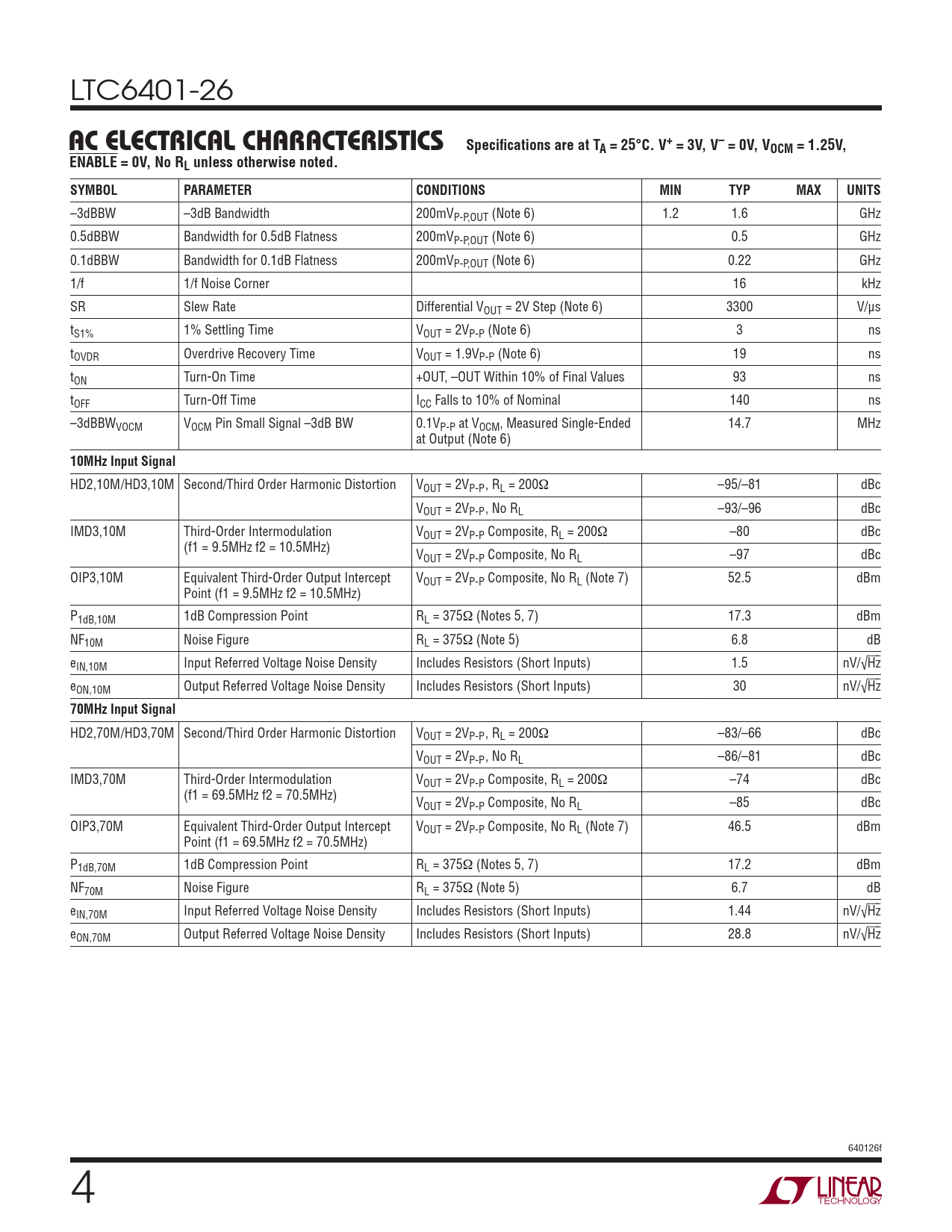 HD2,70M/HD3,70M Second/Third Order Harmonic Distortion VOUT = 2VP-P , RL = 200Ω –83/–66 dBc VOUT = 2VP-P , No RL –86/–81 dBc IMD3,70M Third-Order Intermodulation VOUT = 2VP-P Composite, RL = 200Ω –74 dBc (f1 = 69.5MHz f2 = 70.5MHz) VOUT = 2VP-P Composite, No RL –85 dBc OIP3,70M Equivalent Third-Order Output Intercept VOUT = 2VP-P Composite, No RL (Note 7) 46.5 dBm Point (f1 = 69.5MHz f2 = 70.5MHz) P1dB,70M 1dB Compression Point RL = 375Ω (Notes 5, 7) 17.2 dBm NF70M Noise Figure RL = 375Ω (Note 5) 6.7 dB eIN,70M Input Referred Voltage Noise Density Includes Resistors (Short Inputs) 1.44 nV/√⎯H⎯z eON,70M Output Referred Voltage Noise Density Includes Resistors (Short Inputs) 28.8 nV/√⎯H⎯z 640126f 4