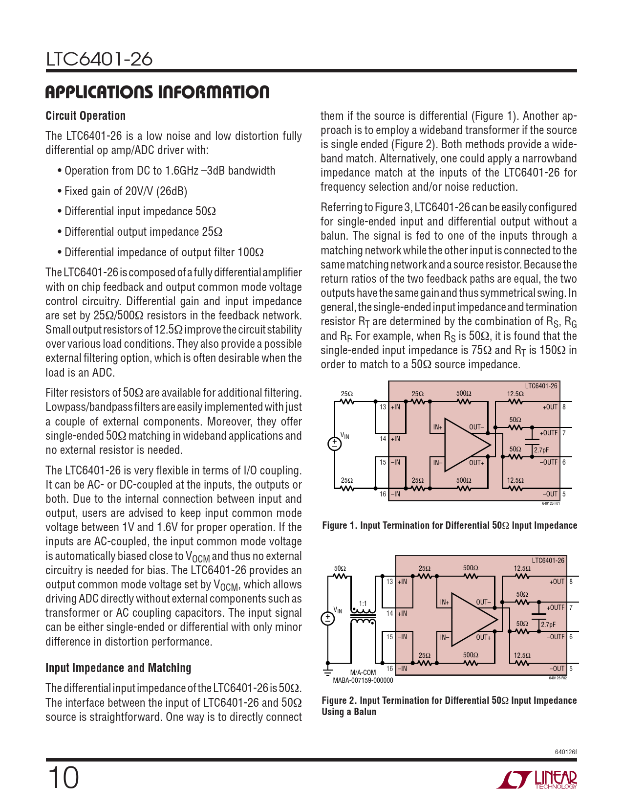 16 –IN –OUT 5 M/A-COM 640126 F02 MABA-007159-000000 The differential input impedance of the LTC6401-26 is 50Ω. The interface between the input of LTC6401-26 and 50Ω