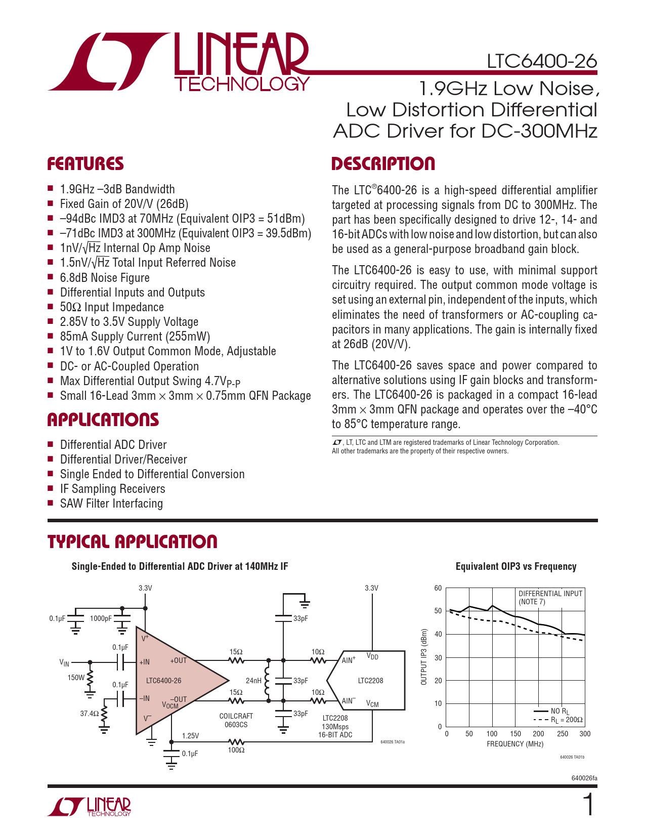 FEATURES. DESCRIPTION. APPLICATIONS. TYPICAL APPLICATION. Single-Ended to Differential ADC Driver at 140MHz IF