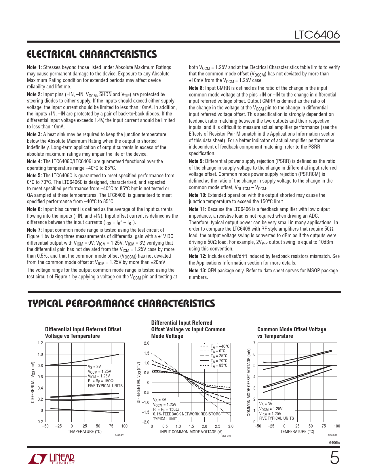 1.2 2.0 7 TA = –40°C TA = 0°C 1.0 1.5 T 6 A = 25°C T 1.0 A = 70°C 0.8 V TA = 85°C TAGE (mV) 5 (mV) S = 3V V (mV) OS OCM = 1.25V OS 0.5 0.6 VICM = 1.25V 4 RI = RF = 150Ω 0 FIVE TYPICAL UNITS 0.4 3 –0.5 0.2 2 DIFFERENTIAL V V DIFFERENTIAL V S = 3V –1.0 VOCM = 1.25V VS = 3V 0 RI = RF = 150Ω VOCM = 1.25V –1.5 1 0.1% FEEDBACK NETWORK RESISTORS COMMON MODE OFFSET VOL VICM = 1.25V TYPICAL UNIT FIVE TYPICAL UNITS –0.2 –2.0 0 –50 –25 0 25 50 75 100 0 0.5 1.0 1.5 2.0 2.5 3.0 –50 –25 0 25 50 75 100 TEMPERATURE (°C) INPUT COMMON MODE VOLTAGE (V) TEMPERATURE (°C) 6406 G01 6406 G02 6406 G03 6406fc 5