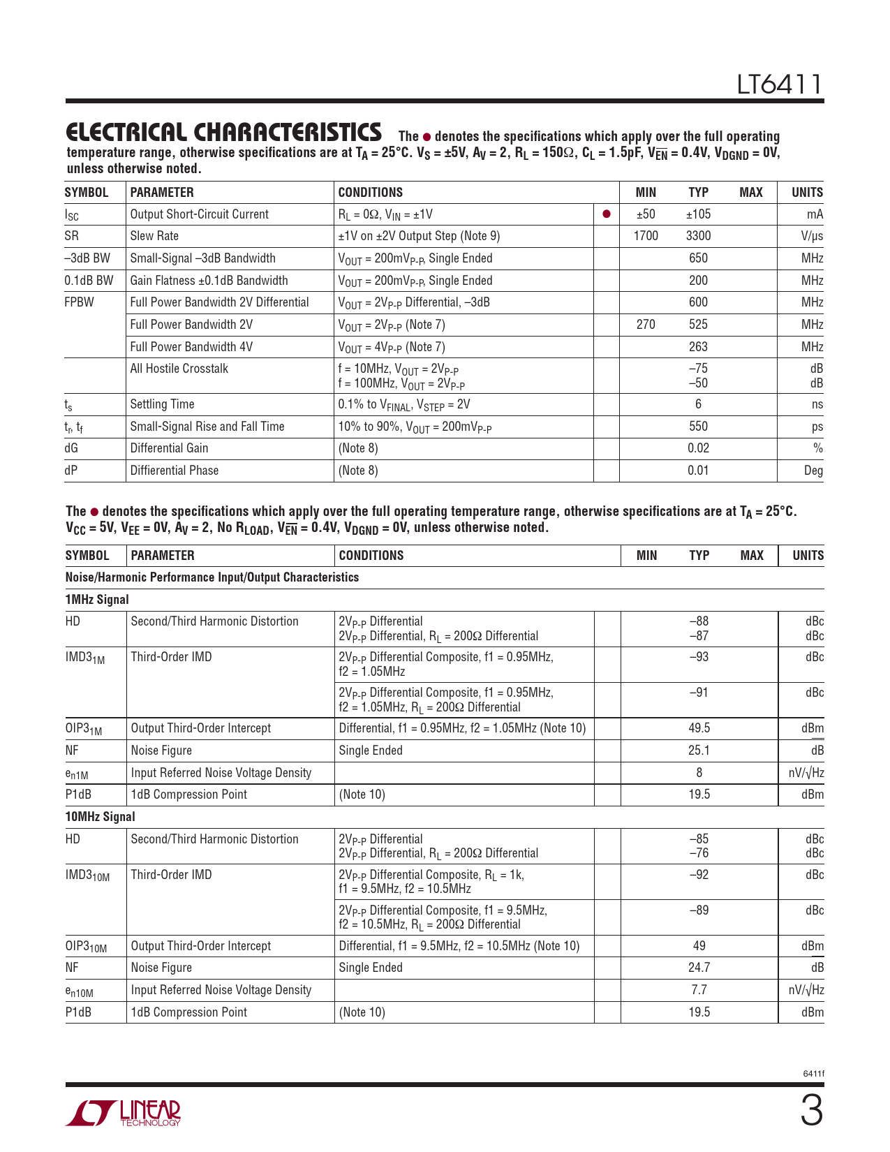 HD Second/Third Harmonic Distortion 2VP-P Differential –85 dBc 2VP-P Differential, RL = 200Ω Differential –76 dBc IMD310M Third-Order IMD 2VP-P Differential Composite, RL = 1k, –92 dBc f1 = 9.5MHz, f2 = 10.5MHz 2VP-P Differential Composite, f1 = 9.5MHz, –89 dBc f2 = 10.5MHz, RL = 200Ω Differential OIP310M Output Third-Order Intercept Differential, f1 = 9.5MHz, f2 = 10.5MHz (Note 10) 49 dBm NF Noise Figure Single Ended 24.7 dB en10M Input Referred Noise Voltage Density 7.7 nV/√Hz P1dB 1dB Compression Point (Note 10) 19.5 dBm 6411f 3