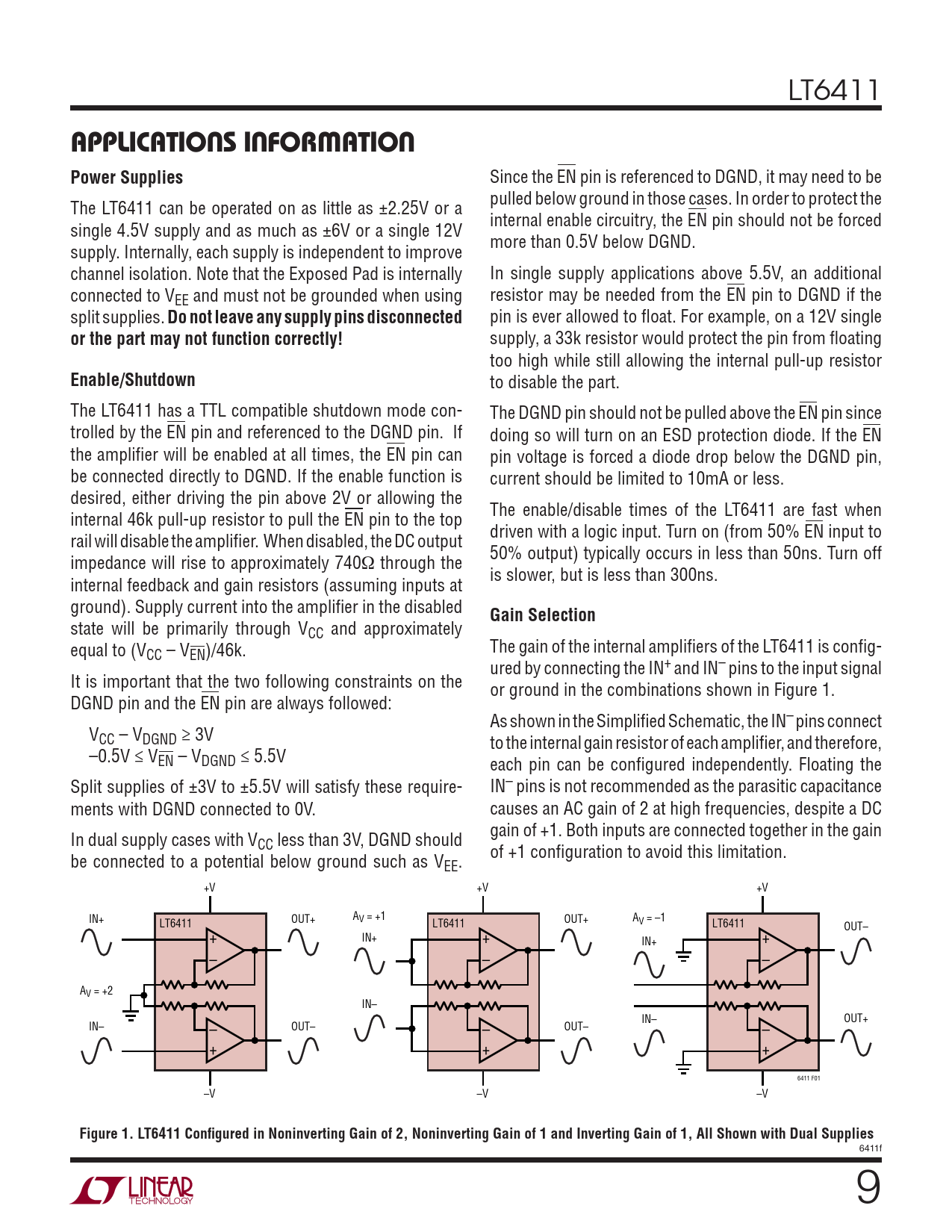 LT6411 APPLICATIONS INFORMATION Power Supplies Since the EN pin is referenced to DGND, it may need to be pulled below ground in those cases. In order to protect the The LT6411 can be operated on as little as ±2.25V or a internal enable circuitry, the EN pin should not be forced single 4.5V supply and as much as ±6V or a single 12V more than 0.5V below DGND. supply. Internally, each supply is independent to improve channel isolation. Note that the Exposed Pad is internally In single supply applications above 5.5V, an additional connected to VEE and must not be grounded when using resistor may be needed from the EN pin to DGND if the split supplies. Do not leave any supply pins disconnected pin is ever allowed to fl oat. For example, on a 12V single or the part may not function correctly! supply, a 33k resistor would protect the pin from fl oating too high while still allowing the internal pull-up resistor Enable/Shutdown to disable the part. The LT6411 has a TTL compatible shutdown mode con- The DGND pin should not be pulled above the EN pin since trolled by the EN pin and referenced to the DGND pin. If doing so will turn on an ESD protection diode. If the EN the amplifi er will be enabled at all times, the EN pin can pin voltage is forced a diode drop below the DGND pin, be connected directly to DGND. If the enable function is current should be limited to 10mA or less. desired, either driving the pin above 2V or allowing the The enable/disable times of the LT6411 are fast when internal 46k pull-up resistor to pull the EN pin to the top driven with a logic input. Turn on (from 50% EN input to rail will disable the amplifi er. When disabled, the DC output 50% output) typically occurs in less than 50ns. Turn off impedance will rise to approximately 740Ω through the is slower, but is less than 300ns. internal feedback and gain resistors (assuming inputs at ground). Supply current into the amplifi er in the disabled Gain Selection state will be primarily through VCC and approximately equal to (V The gain of the internal amplifi ers of the LT6411 is confi g- CC – VEN)/46k. ured by connecting the IN+ and IN– pins to the input signal It is important that the two following constraints on the or ground in the combinations shown in Figure 1. DGND pin and the EN pin are always followed: As shown in the Simplifi ed Schematic, the IN– pins connect VCC – VDGND ≥ 3V to the internal gain resistor of each amplifi er, and therefore, –0.5V ≤ VEN – VDGND ≤ 5.5V each pin can be confi gured independently. Floating the Split supplies of ±3V to ±5.5V will satisfy these require- IN– pins is not recommended as the parasitic capacitance ments with DGND connected to 0V. causes an AC gain of 2 at high frequencies, despite a DC gain of +1. Both inputs are connected together in the gain In dual supply cases with VCC less than 3V, DGND should of +1 confi guration to avoid this limitation. be connected to a potential below ground such as VEE. +V +V +V IN+ AV = +1 OUT+ A LT6411 OUT+ V = –1 LT6411 LT6411 OUT– + IN+ + IN+ + – – – AV = +2 IN– – – IN– – OUT+ IN– OUT– OUT– + + + 6411 F01 –V –V –V Figure 1. LT6411 Confi gured in Noninverting Gain of 2, Noninverting Gain of 1 and Inverting Gain of 1, All Shown with Dual Supplies 6411f 9