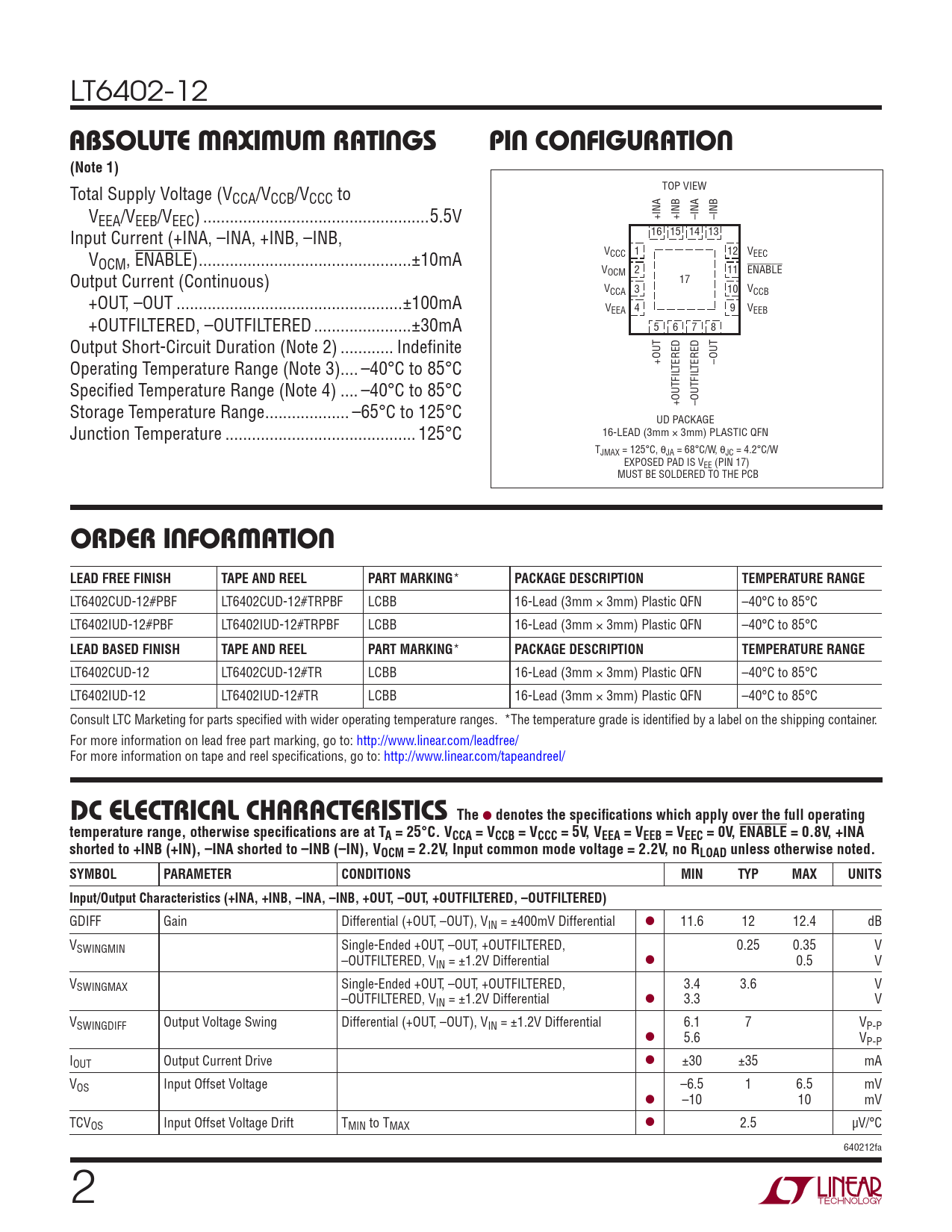 LT6402CUD-12#PBF LT6402CUD-12#TRPBF LCBB 16-Lead (3mm × 3mm) Plastic QFN –40°C to 85°C LT6402IUD-12#PBF LT6402IUD-12#TRPBF LCBB 16-Lead (3mm × 3mm) Plastic QFN –40°C to 85°C
