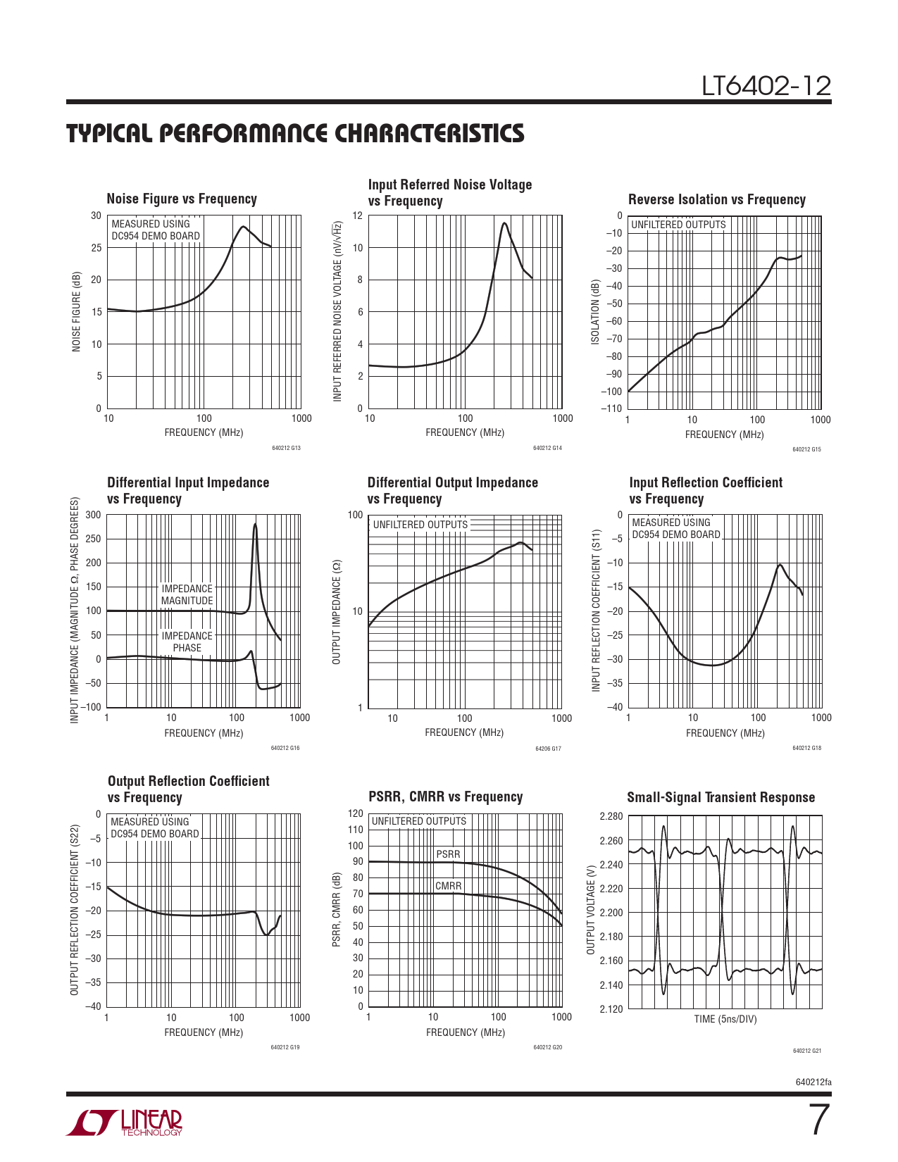 0 120 2.280 MEASURED USING UNFILTERED OUTPUTS 110 –5 DC954 DEMO BOARD 2.260 100 PSRR –10 90 2.240 80 –15 CMRR 2.220 70 TAGE (V) –20 60 2.200 50 –25 2.180 40 PSRR, CMRR (dB) OUTPUT VOL –30 30 2.160 20 –35 2.140 OUTPUT REFLECTION COEFFICIENT (S22) 10 –40 0 2.120 1 10 100 1000 1 10 100 1000 TIME (5ns/DIV) FREQUENCY (MHz) FREQUENCY (MHz) 640212 G19 640212 G20 640212 G21 640212fa 7