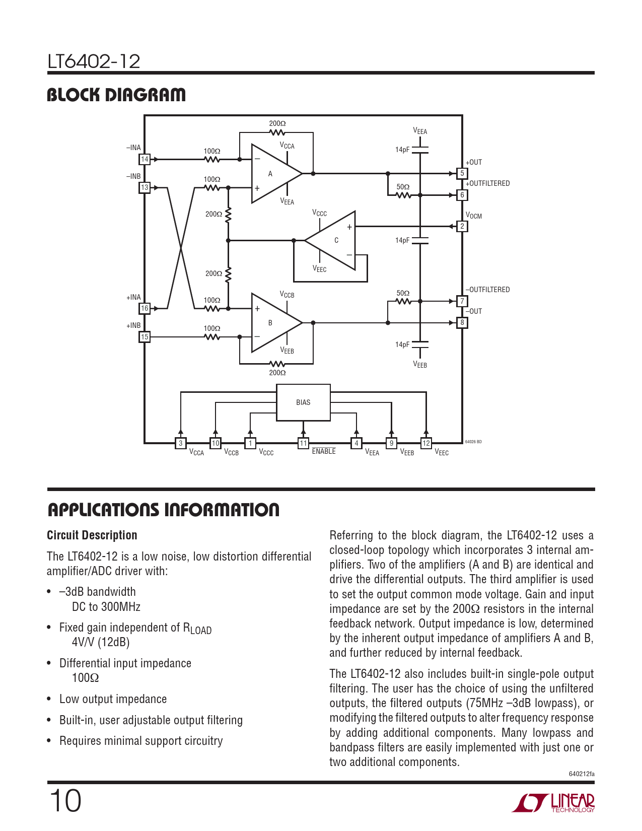 200Ω VEEA –INA VCCA 100 14pF Ω 14 – +OUT A 5 –INB 100Ω +OUTFILTERED 13 + 50Ω 6 VEEA 200Ω VCCC VOCM + 2 C 14pF – VEEC 200Ω 50Ω –OUTFILTERED +INA VCCB 100Ω 7 16 + –OUT B 8 +INB 100Ω 15 – 14pF VEEB VEEB 200Ω BIAS 64026 BD 3 10 1 11 4 9 12 VCCA VCCB VCCC ENABLE V V V EEA EEB EEC