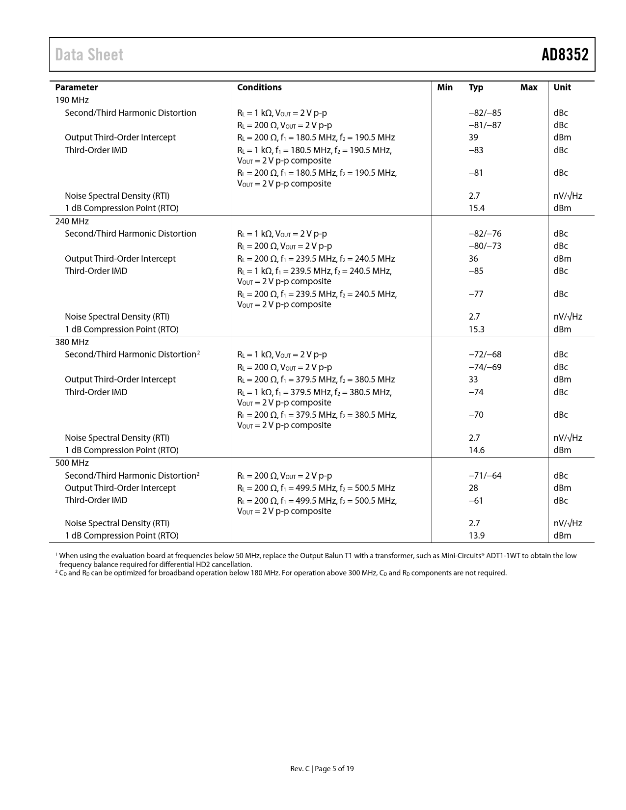 | Pages / Page | 19 / 5 — Data Sheet. AD8352. Parameter. Conditions. Min. Typ. Max. Unit |