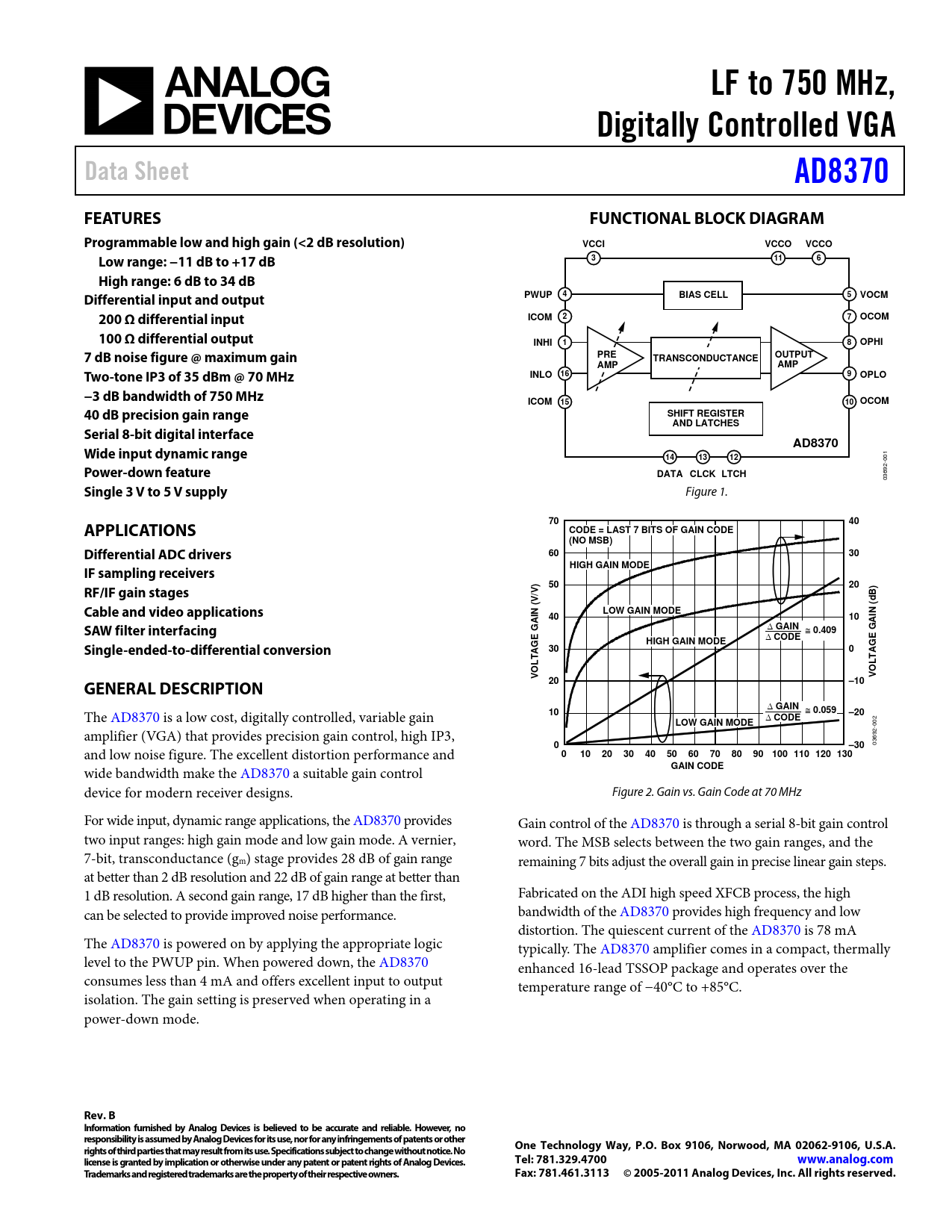 | Pages / Page | 28 / 1 — LF to 750 MHz,. Digitally Controlled VGA. Data Sheet. AD8370. FEATURES. … |