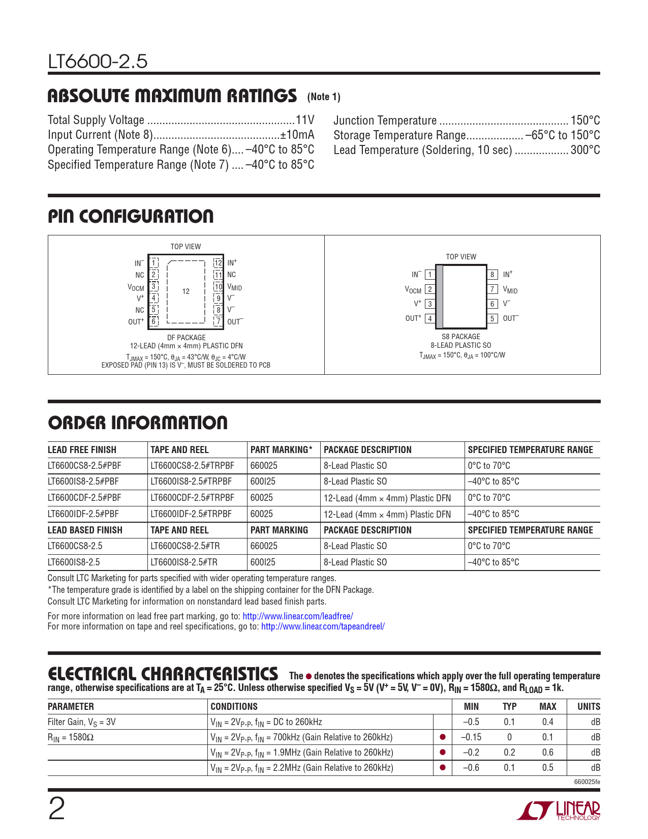 LT6600-2.5 ABSOLUTE MAXIMUM RATINGS (Note 1) Total Supply Voltage ...11V Junction Temperature ... 150°C Input Current (Note 8) ..±10mA Storage Temperature Range ... –65°C to 150°C Operating Temperature Range (Note 6).. –40°C to 85°C Lead Temperature (Soldering, 10 sec) .. 300°C Specifi ed Temperature Range (Note 7) .. –40°C to 85°C PIN CONFIGURATION TOP VIEW TOP VIEW IN– 1 12 IN+ NC 2 11 NC IN– 1 8 IN+ V 3 10 V OCM 12 MID V 2 7 V OCM MID V+ 4 9 V– V+ 3 6 V– NC 5 8 V– OUT+ 4 5 OUT– OUT+ 6 7 OUT– DF PACKAGE S8 PACKAGE 12-LEAD (4mm × 4mm) PLASTIC DFN 8-LEAD PLASTIC SO T T JMAX = 150°C, θJA = 43°C/W, θJC = 4°C/W JMAX = 150°C, θJA = 100°C/W EXPOSED PAD (PIN 13) IS V–, MUST BE SOLDERED TO PCB ORDER INFORMATIONLEAD FREE FINISHTAPE AND REELPART MARKING*PACKAGE DESCRIPTIONSPECIFIED TEMPERATURE RANGE LT6600CS8-2.5#PBF LT6600CS8-2.5#TRPBF 660025 8-Lead Plastic SO 0°C to 70°C LT6600IS8-2.5#PBF LT6600IS8-2.5#TRPBF 600I25 8-Lead Plastic SO –40°C to 85°C LT6600CDF-2.5#PBF LT6600CDF-2.5#TRPBF 60025 12-Lead (4mm × 4mm) Plastic DFN 0°C to 70°C LT6600IDF-2.5#PBF LT6600IDF-2.5#TRPBF 60025 12-Lead (4mm × 4mm) Plastic DFN –40°C to 85°C LEAD BASED FINISHTAPE AND REELPART MARKINGPACKAGE DESCRIPTIONSPECIFIED TEMPERATURE RANGE LT6600CS8-2.5 LT6600CS8-2.5#TR 660025 8-Lead Plastic SO 0°C to 70°C LT6600IS8-2.5 LT6600IS8-2.5#TR 600I25 8-Lead Plastic SO –40°C to 85°C Consult LTC Marketing for parts specifi ed with wider operating temperature ranges. *The temperature grade is identifi ed by a label on the shipping container for the DFN Package. Consult LTC Marketing for information on nonstandard lead based fi nish parts. For more information on lead free part marking, go to: http://www.linear.com/leadfree/ For more information on tape and reel specifi cations, go to: http://www.linear.com/tapeandreel/ ELECTRICAL CHARACTERISTICSThe l denotes the specifi cations which apply over the full operating temperaturerange, otherwise specifi cations are at TA = 25°C. Unless otherwise specifi ed VS = 5V (V+ = 5V, V– = 0V), RIN = 1580Ω, and RLOAD = 1k.PARAMETERCONDITIONSMINTYPMAXUNITS Filter Gain, VS = 3V VIN = 2VP-P, fIN = DC to 260kHz –0.5 0.1 0.4 dB RIN = 1580Ω VIN = 2VP-P, fIN = 700kHz (Gain Relative to 260kHz) l –0.15 0 0.1 dB VIN = 2VP-P, fIN = 1.9MHz (Gain Relative to 260kHz) l –0.2 0.2 0.6 dB VIN = 2VP-P, fIN = 2.2MHz (Gain Relative to 260kHz) l –0.6 0.1 0.5 dB 660025fe 2