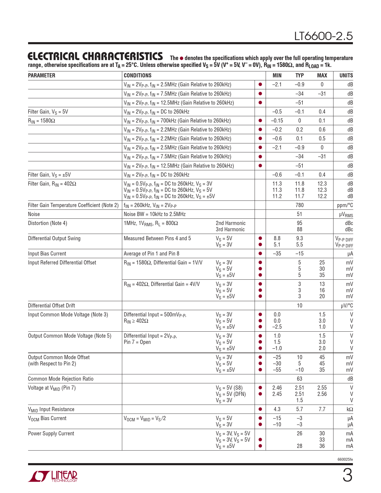 LT6600-2.5 ELECTRICAL CHARACTERISTICSThe l denotes the specifi cations which apply over the full operating temperaturerange, otherwise specifi cations are at TA = 25°C. Unless otherwise specifi ed VS = 5V (V+ = 5V, V– = 0V), RIN = 1580Ω, and RLOAD = 1k.PARAMETERCONDITIONSMINTYPMAXUNITS VIN = 2VP-P, fIN = 2.5MHz (Gain Relative to 260kHz) l –2.1 –0.9 0 dB VIN = 2VP-P, fIN = 7.5MHz (Gain Relative to 260kHz) l –34 –31 dB VIN = 2VP-P, fIN = 12.5MHz (Gain Relative to 260kHz) l –51 dB Filter Gain, VS = 5V VIN = 2VP-P, fIN = DC to 260kHz –0.5 –0.1 0.4 dB RIN = 1580Ω VIN = 2VP-P, fIN = 700kHz (Gain Relative to 260kHz) l –0.15 0 0.1 dB VIN = 2VP-P, fIN = 2.2MHz (Gain Relative to 260kHz) l –0.2 0.2 0.6 dB VIN = 2VP-P, fIN = 2.2MHz (Gain Relative to 260kHz) l –0.6 0.1 0.5 dB VIN = 2VP-P, fIN = 2.5MHz (Gain Relative to 260kHz) l –2.1 –0.9 0 dB VIN = 2VP-P, fIN = 7.5MHz (Gain Relative to 260kHz) l –34 –31 dB VIN = 2VP-P, fIN = 12.5MHz (Gain Relative to 260kHz) l –51 dB Filter Gain, VS = ±5V VIN = 2VP-P, fIN = DC to 260kHz –0.6 –0.1 0.4 dB Filter Gain, RIN = 402Ω VIN = 0.5VP-P, fIN = DC to 260kHz, VS = 3V 11.3 11.8 12.3 dB VIN = 0.5VP-P, fIN = DC to 260kHz, VS = 5V 11.3 11.8 12.3 dB VIN = 0.5VP-P, fIN = DC to 260kHz, VS = ±5V 11.2 11.7 12.2 dB Filter Gain Temperature Coeffi cient (Note 2) fIN = 260kHz, VIN = 2VP-P 780 ppm/°C Noise Noise BW = 10kHz to 2.5MHz 51 μVRMS Distortion (Note 4) 1MHz, 1VRMS, RL = 800Ω 2nd Harmonic 95 dBc 3rd Harmonic 88 dBc Differential Output Swing Measured Between Pins 4 and 5 VS = 5V l 8.8 9.3 VP-P DIFF VS = 3V l 5.1 5.5 VP-P DIFF Input Bias Current Average of Pin 1 and Pin 8 l –35 –15 μA Input Referred Differential Offset RIN = 1580Ω, Differential Gain = 1V/V VS = 3V l 5 25 mV VS = 5V l 5 30 mV VS = ±5V l 5 35 mV RIN = 402Ω, Differential Gain = 4V/V VS = 3V l 3 13 mV VS = 5V l 3 16 mV VS = ±5V l 3 20 mV Differential Offset Drift 10 μV/°C Input Common Mode Voltage (Note 3) Differential Input = 500mVP-P, VS = 3V l 0.0 1.5 V RIN ≥ 402Ω VS = 5V l 0.0 3.0 V VS = ±5V l –2.5 1.0 V Output Common Mode Voltage (Note 5) Differential Input = 2VP-P, VS = 3V l 1.0 1.5 V Pin 7 = Open VS = 5V l 1.5 3.0 V VS = ±5V l –1.0 2.0 V Output Common Mode Offset VS = 3V l –25 10 45 mV (with Respect to Pin 2) VS = 5V l –30 5 45 mV VS = ±5V l –55 –10 35 mV Common Mode Rejection Ratio 63 dB Voltage at VMID (Pin 7) VS = 5V (S8) l 2.46 2.51 2.55 V VS = 5V (DFN) l 2.45 2.51 2.56 V VS = 3V 1.5 V VMID Input Resistance l 4.3 5.7 7.7 kΩ VOCM Bias Current VOCM = VMID = VS /2 VS = 5V l –15 –3 μA VS = 3V l –10 –3 μA Power Supply Current VS = 3V, VS = 5V 26 30 mA VS = 3V, VS = 5V l 33 mA VS = ±5V l 28 36 mA 660025fe 3