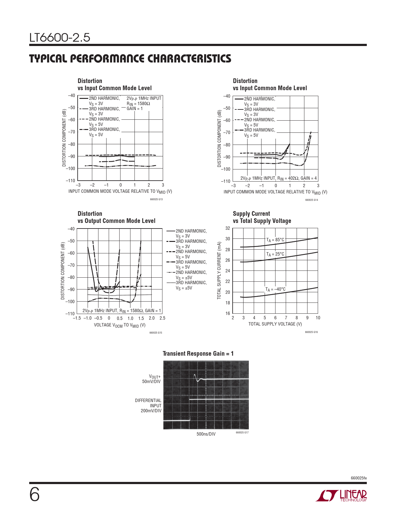 –40 32 2ND HARMONIC, VS = 3V –50 30 3RD HARMONIC, TA = 85°C VS = 3V 28 –60 2ND HARMONIC, T V A = 25°C S = 5V 3RD HARMONIC, 26 –70 VS = 5V 2ND HARMONIC, 24 –80 VS = ±5V 3RD HARMONIC, 22 –90 VS = ±5V T 20 A = –40°C DISTORTION COMPONENT (dB) TOTAL SUPPLY CURRENT (mA) –100 18 2VP-P 1MHz INPUT, RIN = 1580Ω, GAIN = 1 –110 16 –1.5 –1.0 –0.5 0 0.5 1.0 1.5 2.0 2.5 2 3 4 5 6 7 8 9 10 VOLTAGE V TOTAL SUPPLY VOLTAGE (V) OCM TO VMID (V) 660025 G15 660025 G16