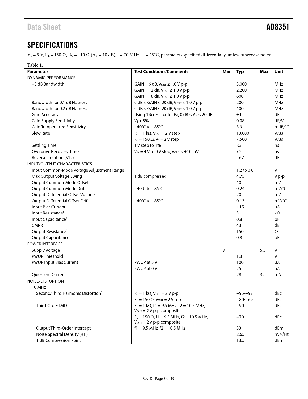 Data Sheet. AD8351. SPECIFICATIONS. Table 1. Parameter Test. Conditions/Comments. Min. Typ. Max. Unit