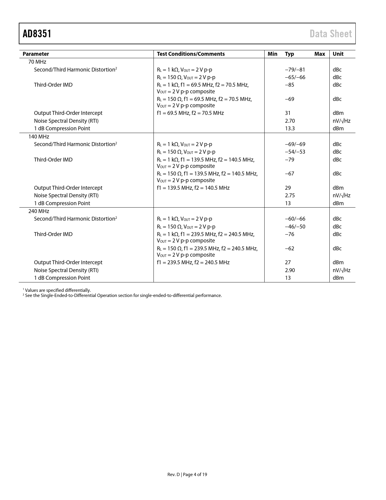 AD8351 Data Sheet Parameter Test Conditions/Comments Min Typ Max Unit